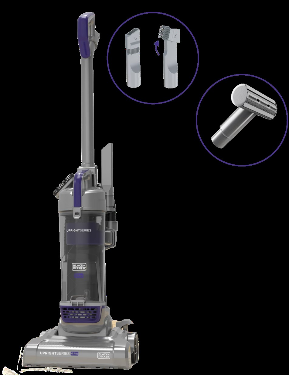 Tackle the toughest messes with the Black & Decker Pet Upright Vacuum. Built with advanced pet hair technology, this powerful upright delivers 1200W of consistent suction through a wide motorized brush roll that cleans faster and more efficiently. The superior anti-tangle brush design cuts through stubborn pet hair without frustrating wrap, while the extra-large 4L dust cup means you can clean longer with fewer trips to empty. The 30-foot cord with convenient cord wrap eliminates the need to switch outlets as you move room to room. A detachable stretch hose and removable suction pole handle above-floor cleaning with ease from furniture to ceiling fans. The lightweight, maneuverable design makes it easy to push across carpets and hard floors. On-board storage keeps your crevice tool, dusting brush, and upholstery tool always within reach, plus it includes an additional specialized pet upholstery tool for deep cleaning pet beds and furniture.Specifications