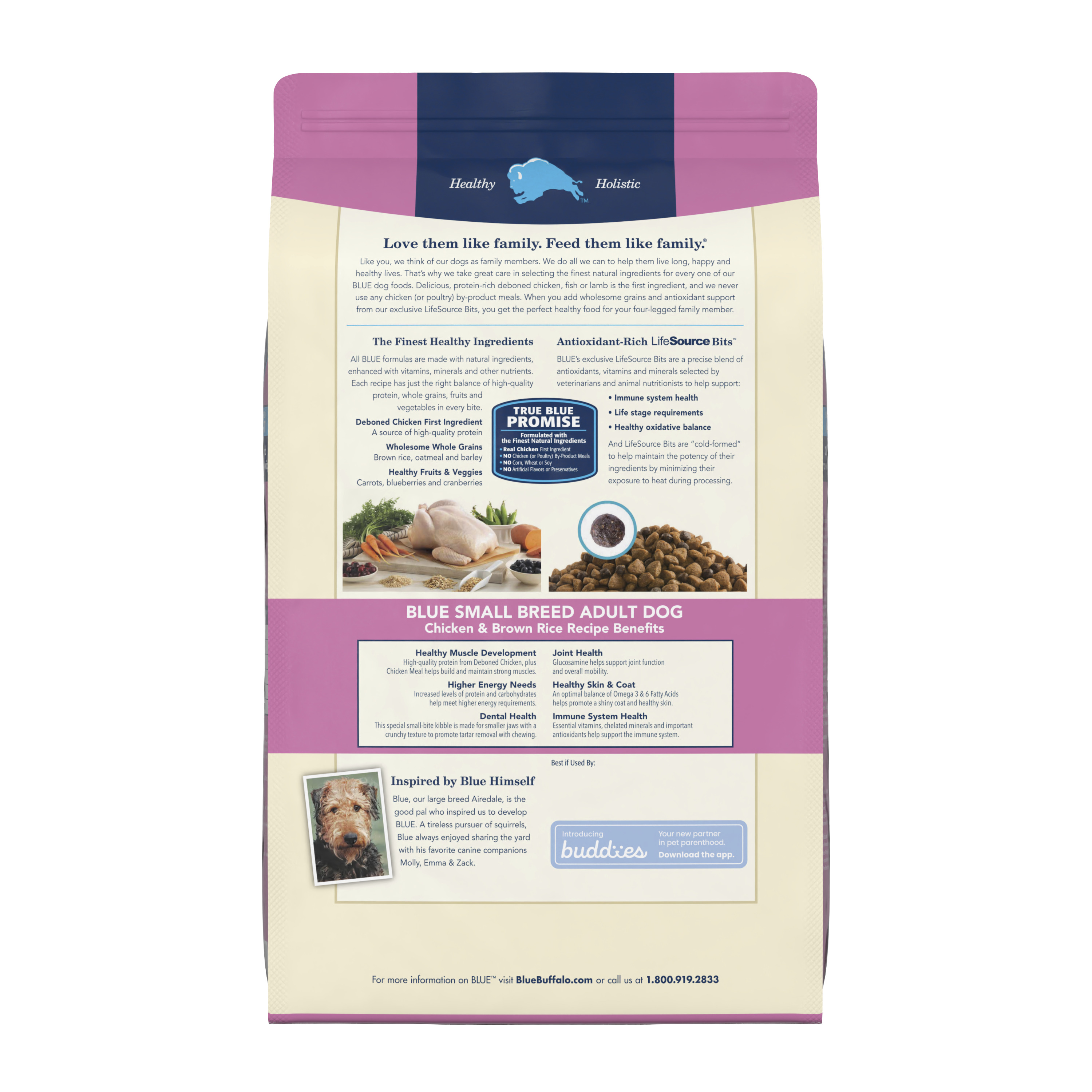 REAL MEAT FIRST: Blue Buffalo foods always feature real meat as the first ingredient; High-quality protein from real chicken helps your dog build and maintain healthy muscles; Plus they contain wholesome whole grains, garden veggies and fruit. SMALL BREED DOG FOOD: Specially formulated for small breed dogs, BLUE Life Protection Formula Small Breed dry dog food contains increased levels of protein and carbohydrates to meet the energy needs of smaller dogs with kibble size ideal for smaller jaws. ANTIOXIDANT-RICH LIFESOURCE BITS: A precise blend of antioxidants, vitamins and minerals carefully selected by holistic veterinarians and animal nutritionists to support immune system health, life stage needs and a healthy oxidative balance. NATURAL DOG FOOD: BLUE dog foods are made with the finest natural ingredients enhanced with vitamins and minerals; BLUE contains NO chicken (or poultry) by-product meals, corn, wheat, soy, artificial flavors or preservatives.Specifications