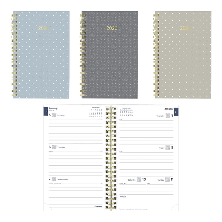 (WE CANNOT GUARANTEE A SPECIFIC COLOR) If you'd like us to choose for you, we are more than happy to do so. If not,please visit us in store to pick your favorite color. The Blueline Essential Weekly/Monthly Planner, in pleasing Minimalist design, features 12 months from January to December 2026, with week on two-pages spread and monthly planner before each month. Ruled space for each day. Flexible gold twin-wire binding with durable, poly cover allows planner to fold back for a flat and sturdy writing surface. Includes: reference calendars of current and future months, numbered weeks, countdown of days passed and days to come (Julian dates), holidays, moon phases, and tear-off corners help keep place. Extra bonus pages include: quarterly planners, dedicated contacts (telephone/address/email) and notes sections. English, size: 8" x 5". Eco-conscious planner crafted from 100% post-consumer recycled paper. Certified under FSC license code: FSC C102682. The Forest Stewardship Council enables businesses and consumers to choose products made with materials sourced from responsible forestry, promoting environmentally appropriate, socially beneficial, and economically viable management of the world's forests. Made in Canada.The future of planning is here with Blueline Plan & Link. Just plan, scan, click, and go for synchronicity in planning. Link your compatible Blueline planner featuring Plan & Link to your phone using the QR codes printed in the planner for seamless pen to technology synchronization. Write in your planner, scan the QR code printed on the date, take a picture, and set the date and reminder using the free Blueline Reminder app. Download the free Blueline Reminder app, powered by InkLink technology, from the App Store and Google Play. Blueline is the brand of choice when it comes to selection and affordability. Used in the office, home or classroom, the extensive line of Blueline dated products offers the widest variety of formats and constructions to meet every possible need. Blueline Dated Products are produced using acid-free paper to prevent color-change over time and vegetable oil-based inks to help protect the environment. Blueline since 1917. (C101PT.ASX)Specifications