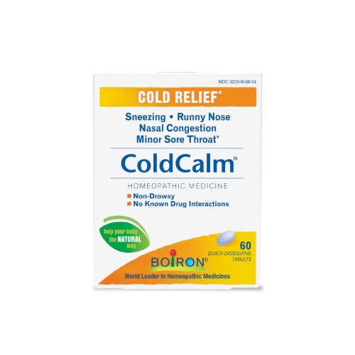 Boiron cough cold and flu medicines do not cause drowsiness or sleeplessness; Box of 60 quick-dissolving tablets; Coldcalm Tablets address symptoms at every stage of a cold; Coldcalm Tablets do not cause drowsiness and it has no known interactions with other medications; It temporarily relieves symptoms such as sneezing runny nose nasal congestion and minor sore throat; Recommended ages 3 and up