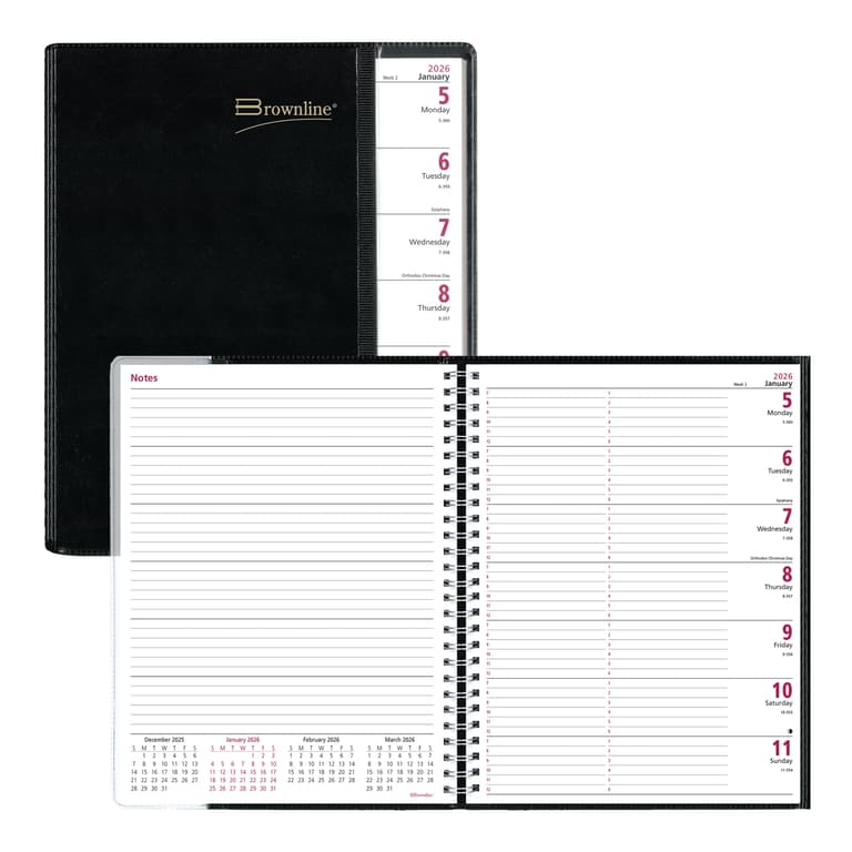 Always on the right page with Pre-Vu! The Brownline Pre-Vu Weekly Planner contains 12 months of planning, from January 2026 to December 2026, in a crafty, three-panel FLIP and FOLD cover with flexible, twin-wire binding. Pre-Vu incorporates an interior flap to pick up where you left off with ease: Flip the right-side page to show the current week. Fold the left notes page underneath. View the current week through the front-cover transparent window. Contains hourly appointment schedule from 7:00 a.m. to 6:00 p.m. for the full week with ruled notes area for each day. Practical attention to detail includes: quarterly planners for 2026 and 2027, reference calendars of past, current and future two (2) months on each spread, countdown of days passed, days to come (Julian dates), numbered weeks, and expense summary. Black cover. English, size: 11" x 8-1/2". Eco-conscious planner crafted from 100% post-consumer recycled fiber paper materials. Certified under FSC license code: FSC C102682. The Forest Stewardship Council enables businesses and consumers to choose products made with materials sourced from responsible forestry, promoting environmentally appropriate, socially beneficial, and economically viable management of the world's forests. Made in Canada.Innovation is once again at the crossroads with Pre-Vu, a weekly planner that gives you a new way of looking at the coming week. Brownline is the brand of choice when it comes to selection and affordability. Used in the office, home or classroom, the extensive line of Brownline dated products offers the widest variety of formats and constructions to meet every possible need. Brownline Dated Products are produced using acid-free paper to prevent color-change over time and vegetable oil-based inks to help protect the environment. Brownline since 1846. (CB925.BLK)Specifications