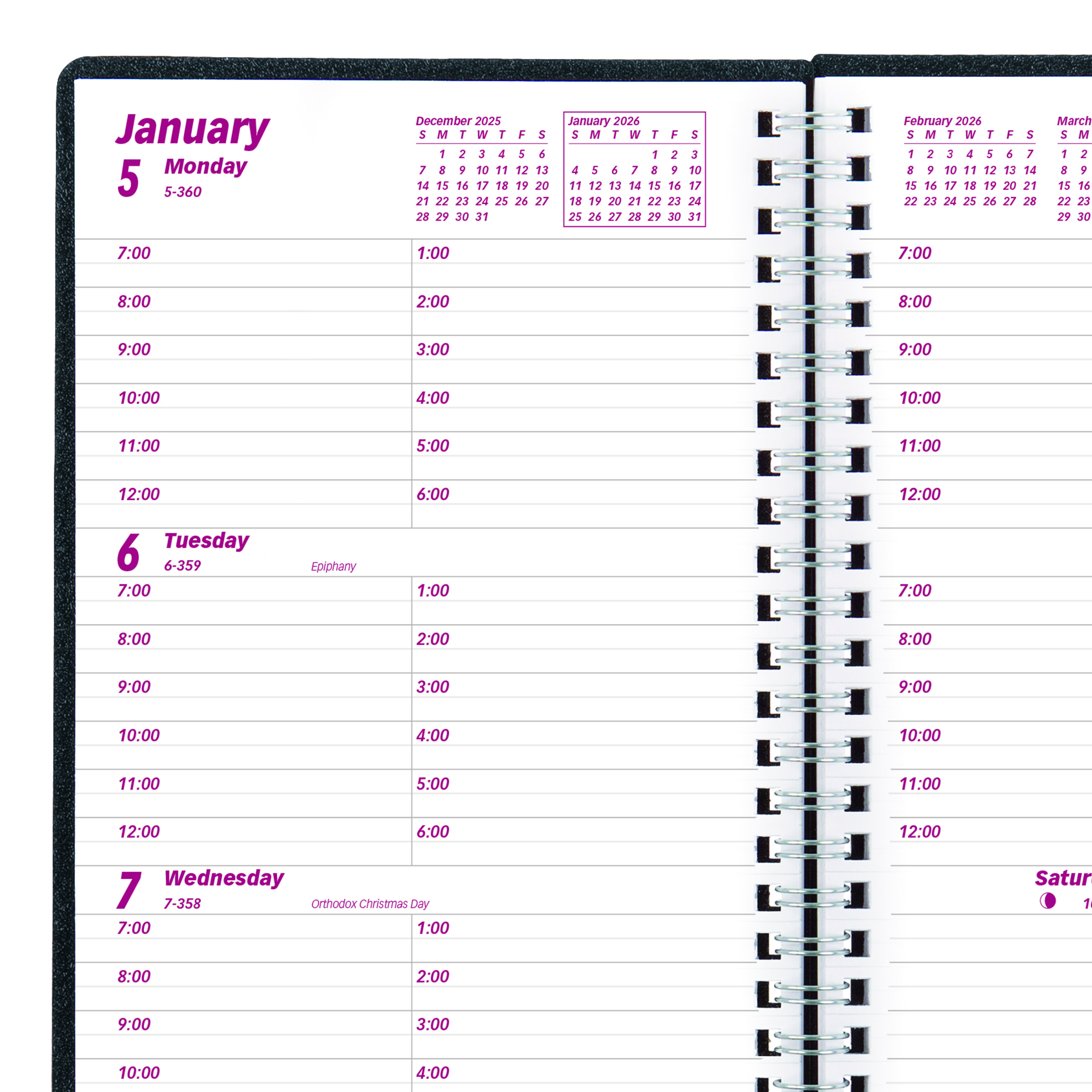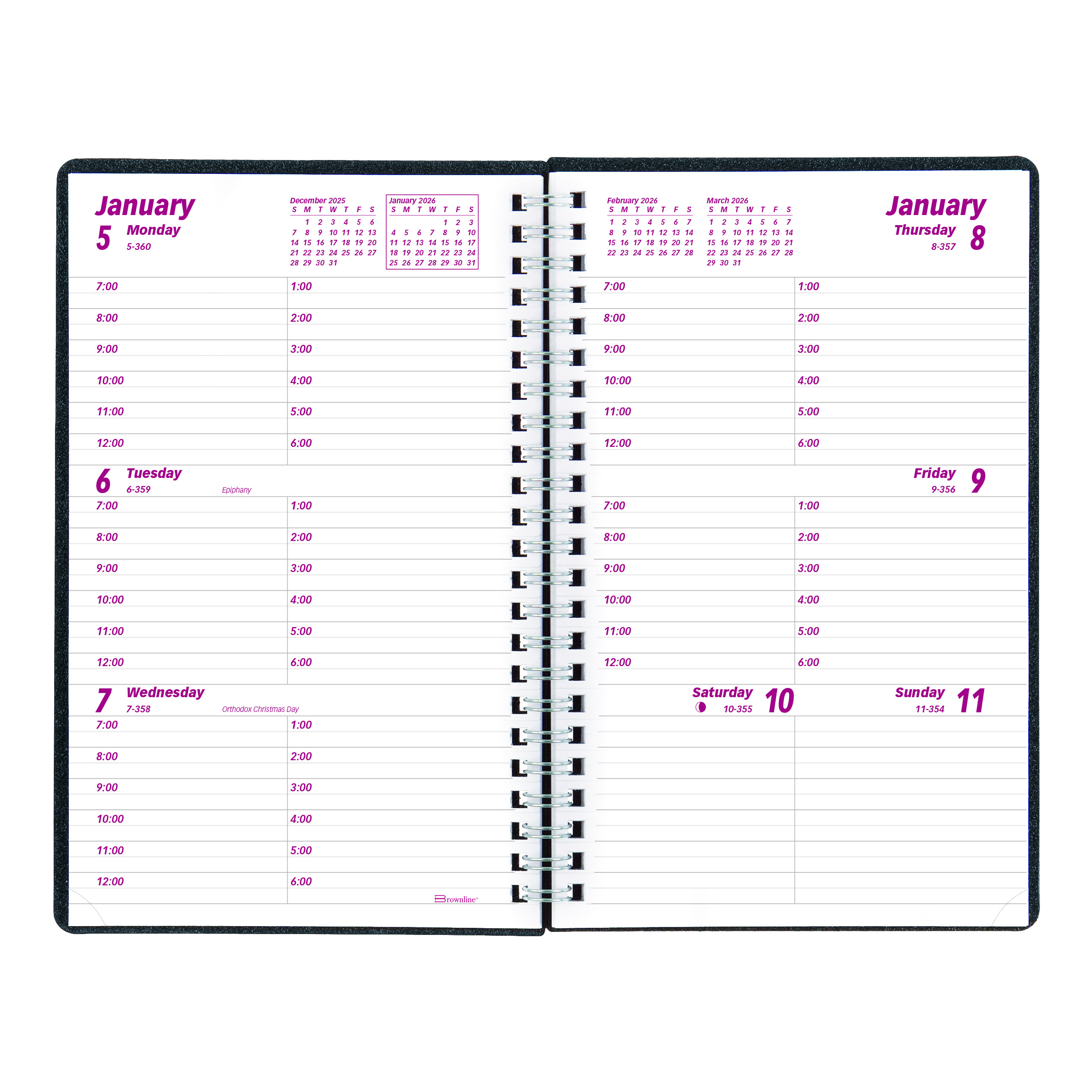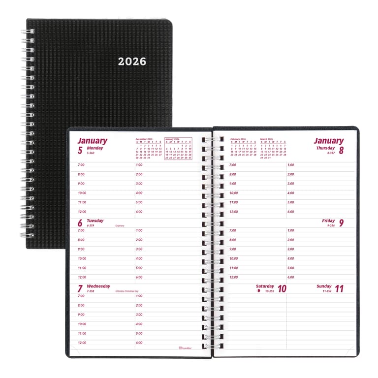 The Brownline DuraFlex Weekly Planner and Appointment Book features 12 months of planning, spanning January to December 2026, with one week per two-page spread in an appointment schedule format. Weekday hourly appointment schedule from 7:00 a.m. to 6:00 p.m. and ruled spaces for Saturday and Sunday. Contains reference calendars of past, current and future months on each spread. Daily countdown of days passed and days to come, highlights holidays and phases of the moon. Tear-off corners to help keep place. Contacts section for telephone, address, and email information. The textured poly cover is constructed with flexible twin-wire binding for a flat and sturdy writing surface. English, size: 8" x 5". Eco-conscious planner crafted from 100% post-consumer recycled paper. Certified under FSC license code: FSC C102682. The Forest Stewardship Council enables businesses and consumers to choose products made with materials sourced from responsible forestry, promoting environmentally appropriate, socially beneficial, and economically viable management of the world's forests. Made in Canada.Brownline is the brand of choice when it comes to selection and affordability. Used in the office, home or classroom, the extensive line of Brownline dated products offers the widest variety of formats and constructions to meet every possible need. Brownline Dated Products are produced using acid-free paper to prevent color-change over time and vegetable oil-based inks to help protect the environment. Brownline since 1846. (CB75V.BLK)Specifications