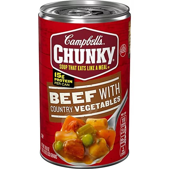 Campbell's Chunky Soup: 18.8 oz can of Campbell’s Chunky Beef Soup with Country Vegetables. Big Flavors: Vegetable beef soup with big chunks of beef and hearty veggies like carrots, celery, peas and potatoes in beef broth. 15 grams of Protein: Pantry Staple: Enjoy this soup at home or at work as part of a delicious, filling lunch, or take on outdoor adventures to eat by the campfire. Microwavable Soup: This easy to microwave soup is simple to prepare, just heat in a microwave-safe bowl and serve as an appetizer or main dish.Specifications