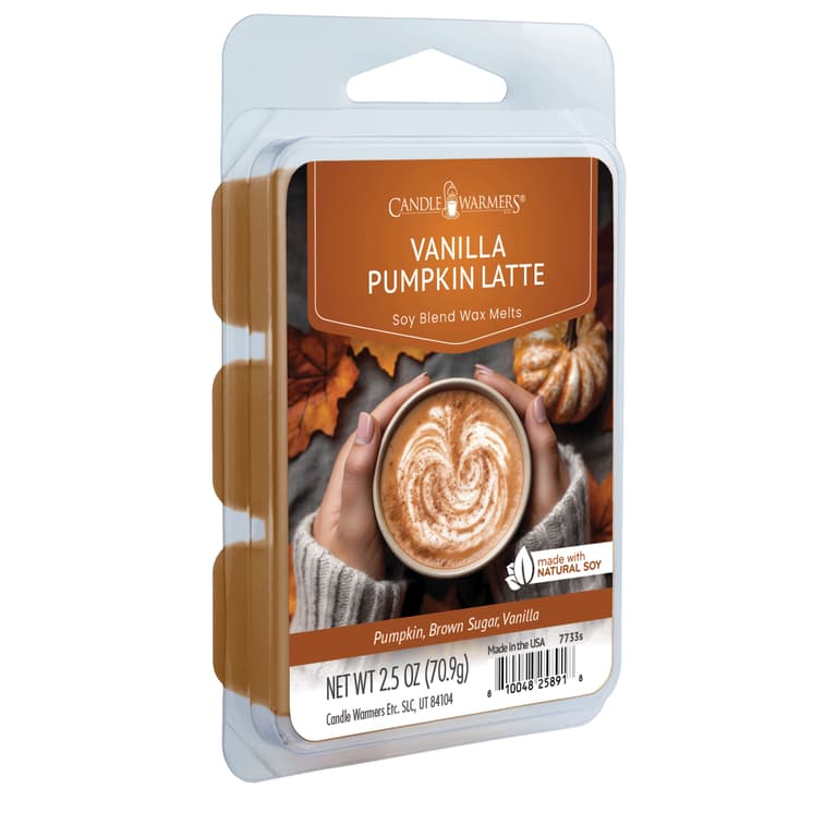 VANILLA PUMPKIN LATTE: Warm pumpkin and vanilla cream coated in crystalized sugar. TOP NOTES: Pumpkin, Pecan Praline MID NOTES: Nutmeg, Cinnamon, Sweet Potato, Caramel BASE NOTES: Brown Sugar, Vanilla Melts are made of soy wax, which is both biodegradable and sustainably sourced. Each 2.5 oz melt wax has a melt time of 30 hours. Classic Wax Fragrances contain both fine fragrances and natural ingredients. Our soy wax holds a high fragrance load and is proudly poured in the USA! Wax melts offer a no flame, no soot, no smoke sensory experience. Pair with one of our Candle Warmers Etc. Fragrance Warmers, available in a variety of styles and colors.2.5 oz of wax is poured into a plastic tray that divides wax into 6 cubes. Tray can be used for wax-cooling and remelting your wax later! Classic Fragrance Wax Melt Collection from Candle Warmers Etc. is made of soy wax, which is creamy and smooth, combined with rich colors and the finest home fragrance. Our proprietary soy wax holds a high fragrance load, providing a strong and clean throw compared to traditional waxes. They can be used in our wide variety of fragrance warmers. 2.5 oz wax melts have a melt time of 30 hours.Specifications