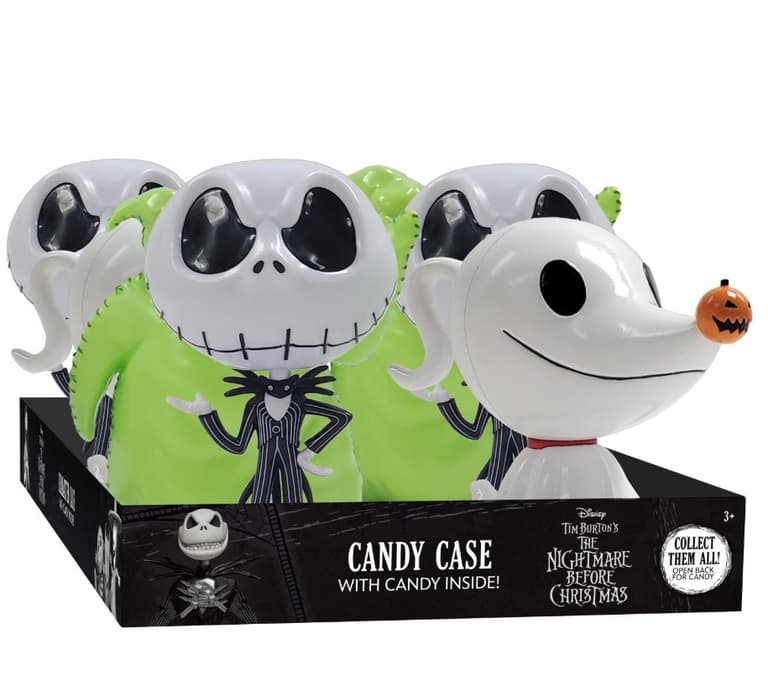 ( WE CANNOT GUARANTEE A SPECIFIC COLOR OR STYLE) CANDYRIFIC DISNEY NIGHTMARE BEFORE CHRISTMAS CANDY CASES ARE FULLY SCULPTED CASES OF JACK SKELLINGTON OOGIE BOOGIE AND ZERO. EACH CASE COMES WITH ASSORTED FRUIT FLAVORED CANDY.Specifications