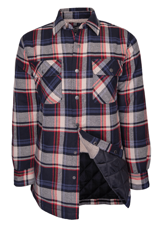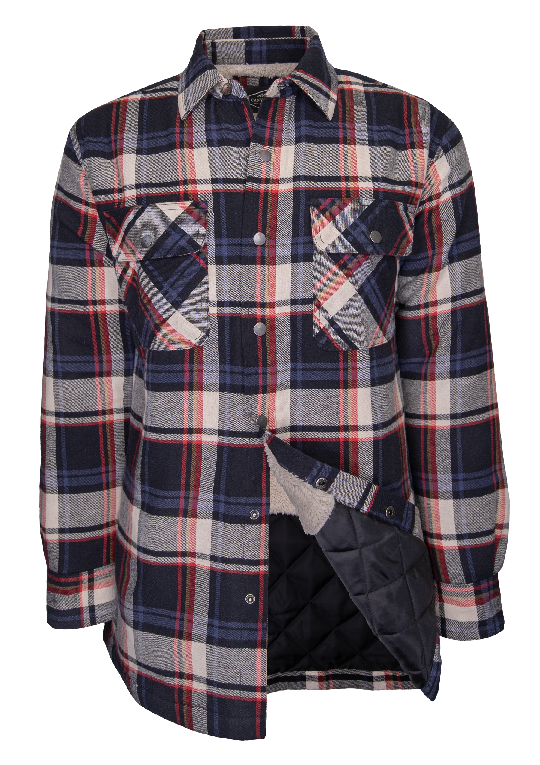 100% COTTON FLANNEL; 2 CHEST POCKETS; LOWER SIDE SEAM POCKETS; NYLON QUILTED KICKER; SHERPA LINED; SNAP CLOSURE