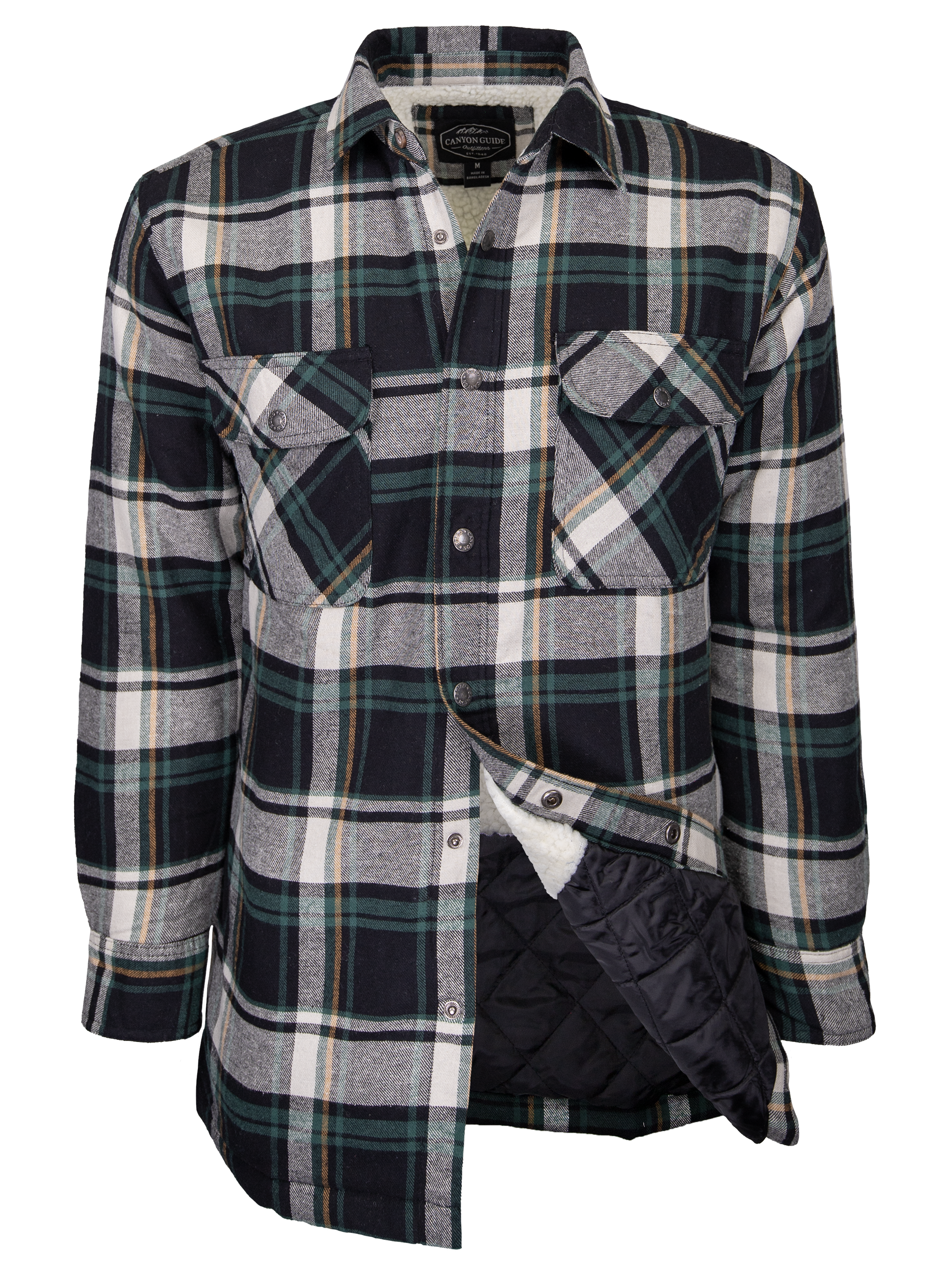 100% COTTON FLANNEL; 2 CHEST POCKETS; LOWER SIDE SEAM POCKETS; NYLON QUILTED KICKER; SHERPA LINED; SNAP CLOSURE