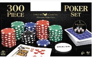 300 professional dual-toned 11.5 g poker chips1 deck of poker cards1 dealer button2 betting buttons5 poker dice1 instruction sheet1 aluminum case