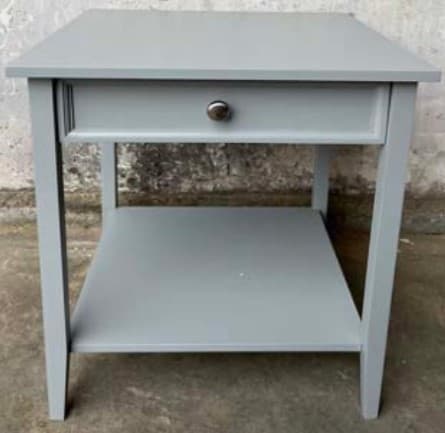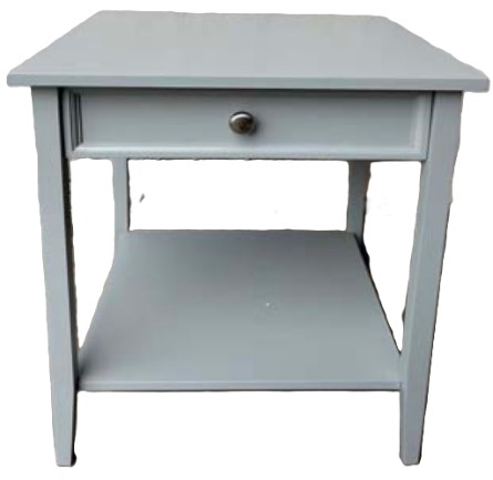 Acacia Wood End Table w Full Size Drawer and Bottom Shelf; Gray Finish w Brushed Nickel Pulls; Size: 21"W x 21"D x 24"H; Solid Acacia Legs and Drawer Front; Wood Drawer Glide