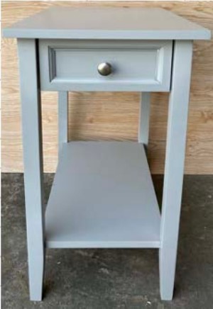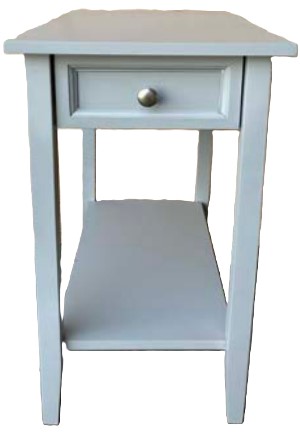 Acacia Wood Recliner Table w Full Size Drawer and Bottom Shelf; Solid Acacia Legs and Drawer Front; Gray Finish w Brushed Nickel Pulls; Wood Drawer Glide; Size: 13"W x 22"D x 24"HSpecifications