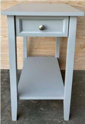Acacia Wood Recliner Table w Full Size Drawer and Bottom Shelf; Gray Finish w Brushed Nickel Pulls; Size: 13"W x 22"D x 24"H; Solid Acacia Legs and Drawer Front; Wood Drawer Glide