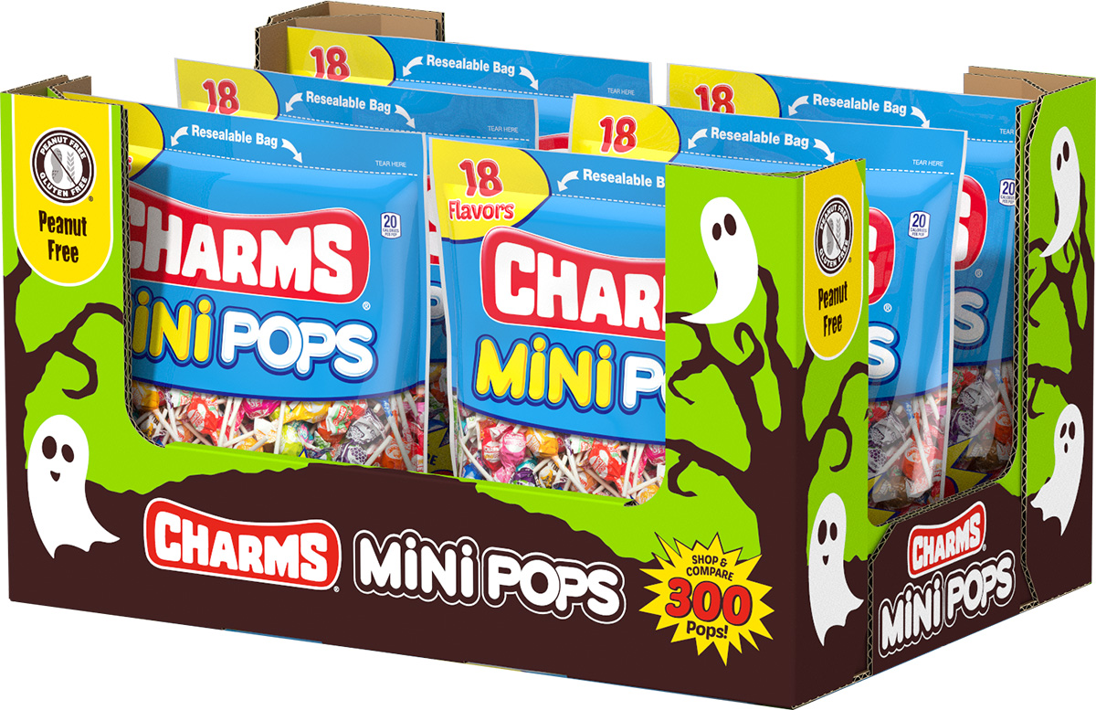 CHARMS MINI LOLLIPOPS COME IN A 300 COUNT BAG OF 18 FLAVORS THAT INCULDE WATERMELON, COTTON CANDY, GREEN APPLE, BIRTHDAY CAKE, CHERRY, APPLE PIE, FRUIT PUNCH, STRAWBERRY LEMONADE, STRAWBERRY ,BANANA, MANGO, BLUE RASPBERRY, ORANGE CREAM, GRAPE, ORANGE, BUBBLE GUM, LIMEADE AND ROOT BEER FLOAT.THESE MINI LOLLIPOPS ARE PERFECT FOR HANDING OUT TO TRICK OR TREATERS OR FOR ANY BIG CELEBRATIONS.Specifications