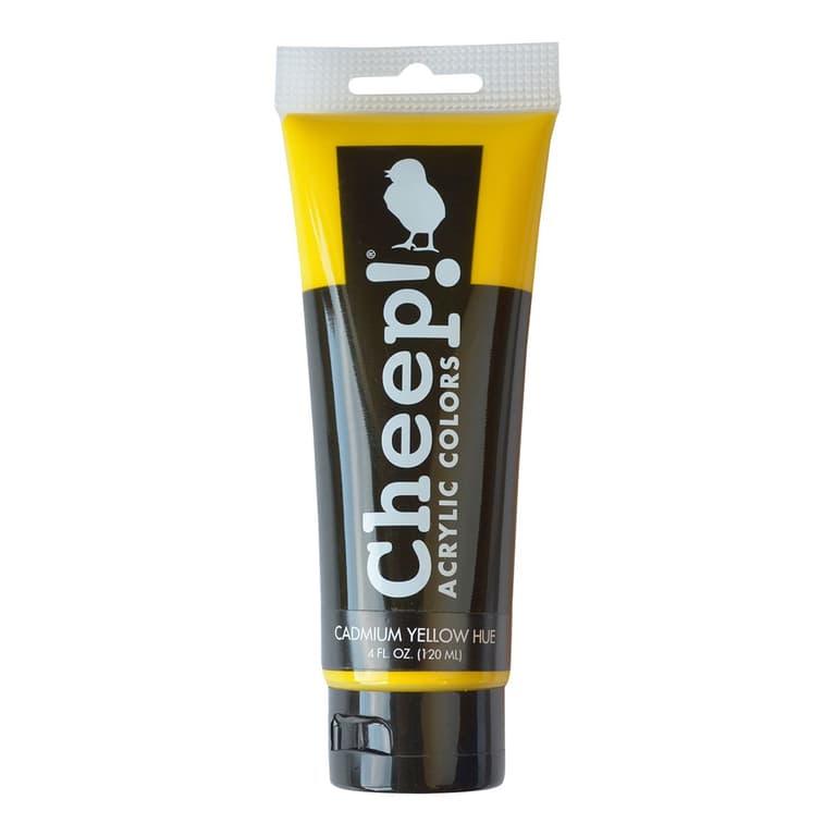 Cheep! Acrylic Paint is an economical line of paint that doesn’t compromise on quality. Bright colors with a creamy, soft body consistency that can be used on a variety of surfaces: paper, wood, fabric, and metal. Non-toxic, cleans up with soap and water. 4oz Tube Cadmium Yellow Hue- Flip top cap combines securely sealed lid with easy dispensing.Specifications