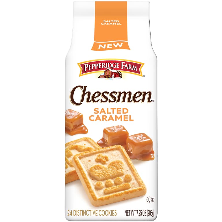 Indulge in an elegant flavor twist with Pepperidge Farm Chessmen Salted Caramel cookies. Subtly sweet, these Chessmen cookies infuse buttery flavor with notes of salted caramel. Each Salted Caramel Chessmen cookie is golden-baked to a tender crisp and stamped with a classic chess piece, making it a whimsical, melt-in-your-mouth treat.Specifications