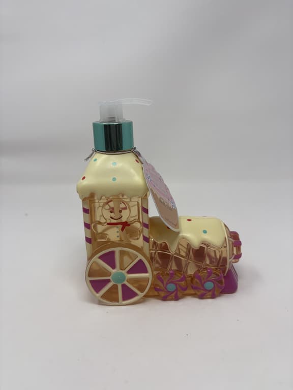 This is vanilla frosted scented hand soap that is shaped as gingerbread train. Great for the holiday season, Can be a decoration for a bathroom or kitchen sink.Specifications