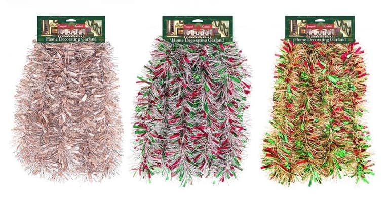 This Christmas Tinsel Garland can be displayed over doors, windows, fireplace mantels, or stairway railings in indoor or covered outdoor locations.Specifications