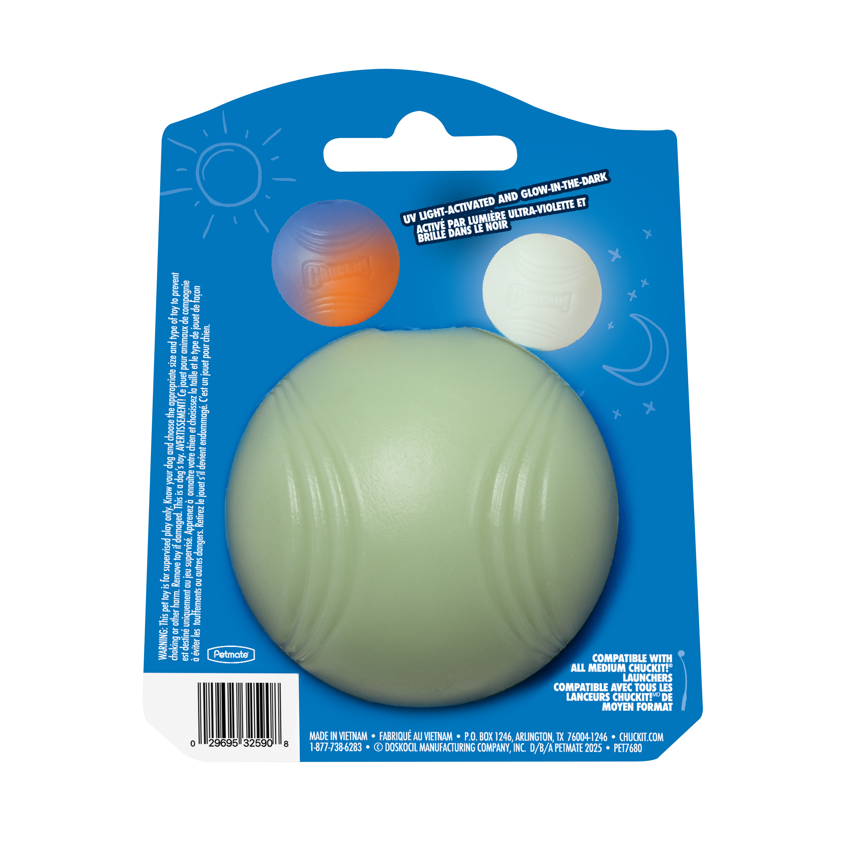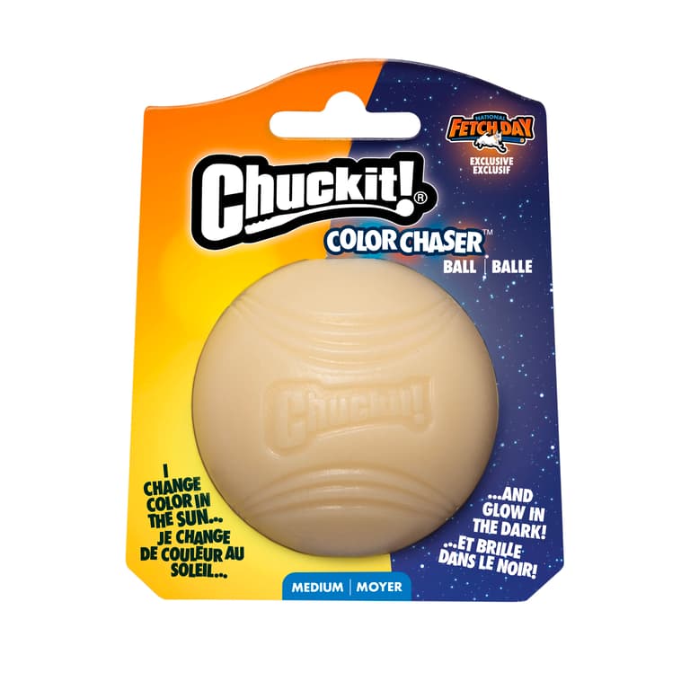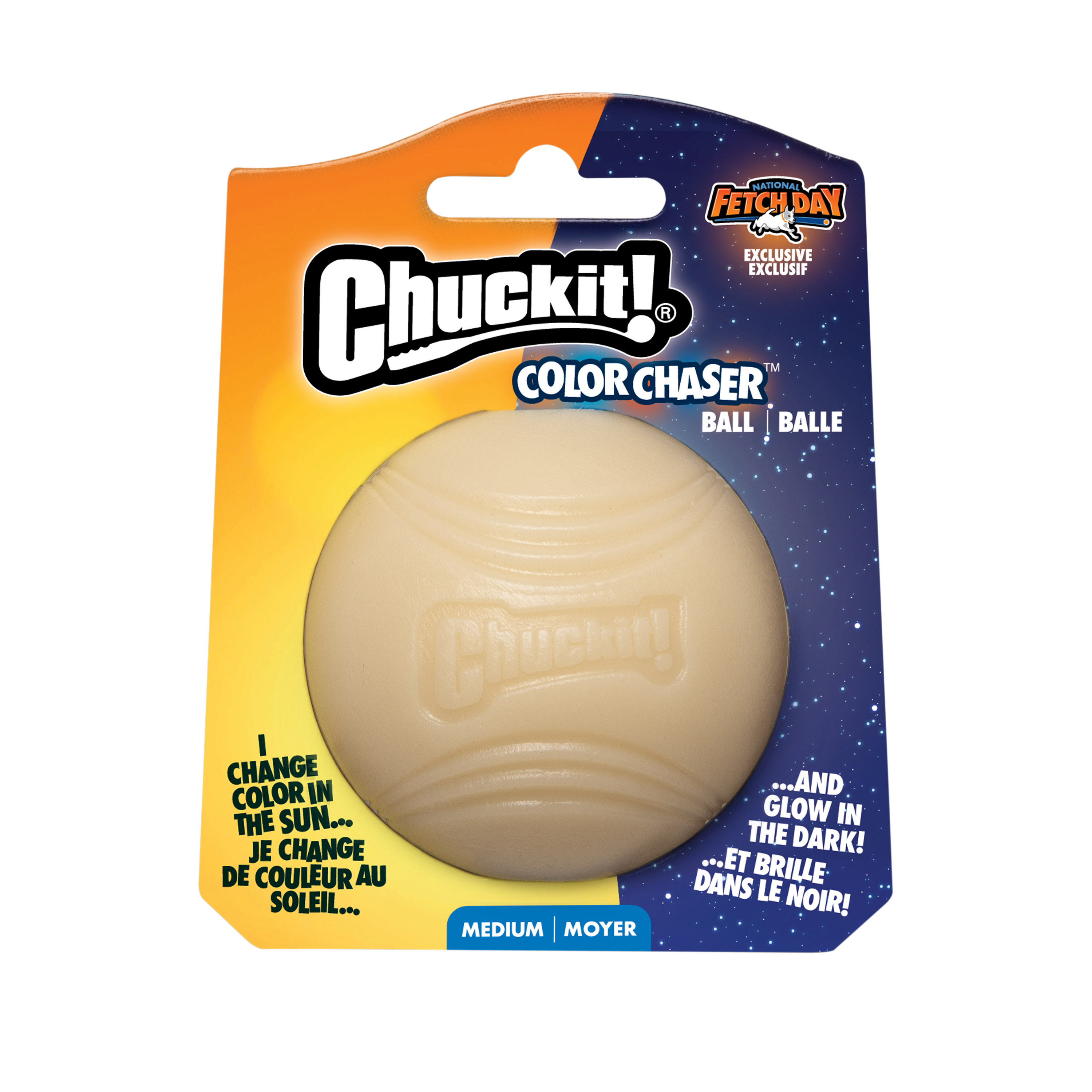 (WE CANNOT GUARANTEE A SPECIFIC COLOR) If you'd like us to choose for you, we are more than happy to do so. If not, please visit us in store to pick your favorite color.Chuckit Color Chaser balls! Glow in the dark and UV color change allows fetch to happen anytime during the day or night!Specifications