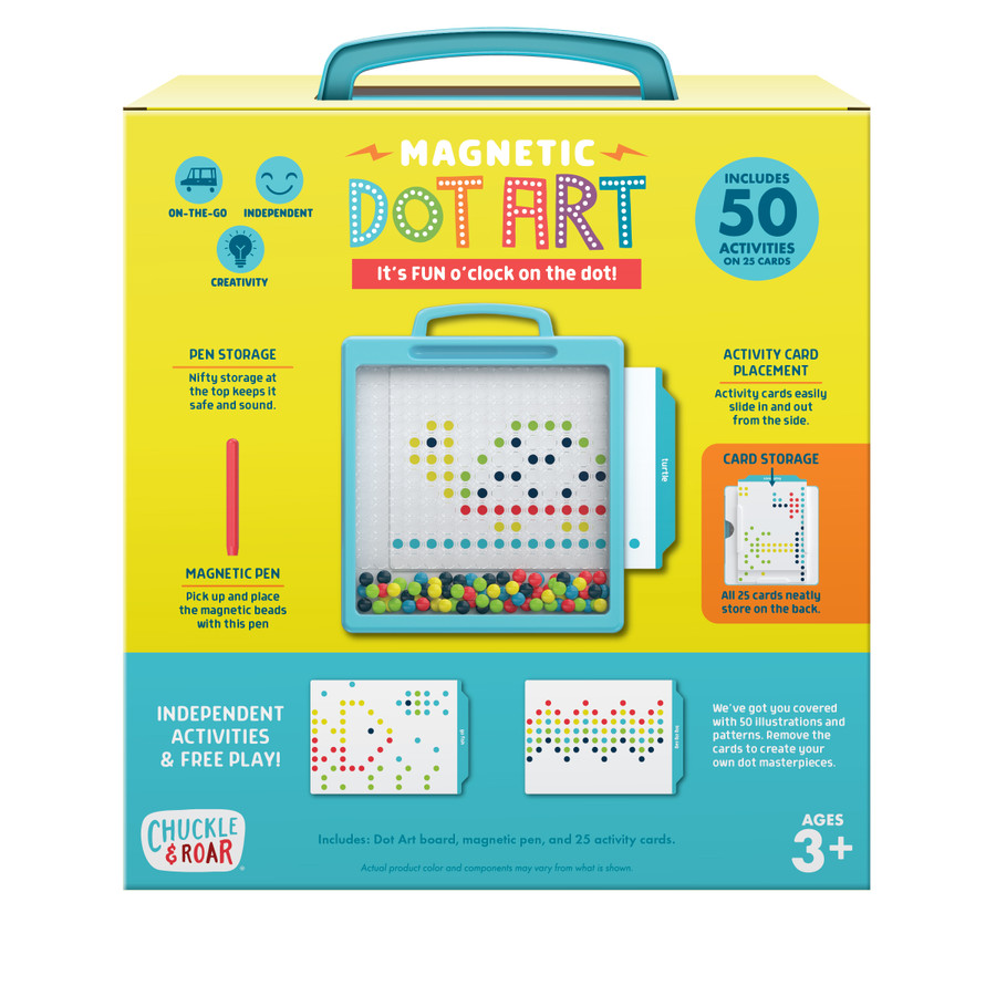 It’s FUN o’ clock on the dot with this self-contained, travel-friendly, and mess free Dot Art! This kit is perfect for travel; all the beads are self-contained and the magnetic pen and activity cards are stored easily in the back of the designer. Just use the magnetic pen to pick up the beads and place them into the grid and when you are ready for a new design, dump them out for endless fun. We’ve got you covered with 50 illustrations and patterns, or remove the cards to create your own dot masterpiece. This on-the-go activity will keep kids engaged while nurturing creativity and independent play.Specifications