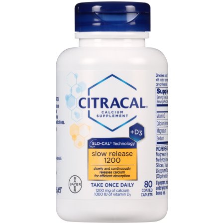 SLO-CAL Technology. Slowly & Continuously Releases Calcium For Efficient Absorption. 1200 mg of Calcium. 1000 IU of Vitamin D3. Take Once Daily. #1 Doctor & Pharmacist Recommended Calcium Brand. Defy bone aging with Citracal calcium and a high level of D3. Adequate calcium and vitamin D throughout life, as part of a well-balanced diet, may reduce the risk of osteoporosis. With Slo-Cal Technology, you can address your daily calcium needs with a single serving of Citracal. What is Citracal slow release 1200? Slo-Cal Technology is a patent-pending technology that has been specifically developed to provide efficient calcium absorption in one daily dose. Citracal Slow Release 1200 contains 1200 mg of calcium plus 1000 IU of vitamin D3 in one daily dose. Made in the USA of US & Imported Materials.Specifications