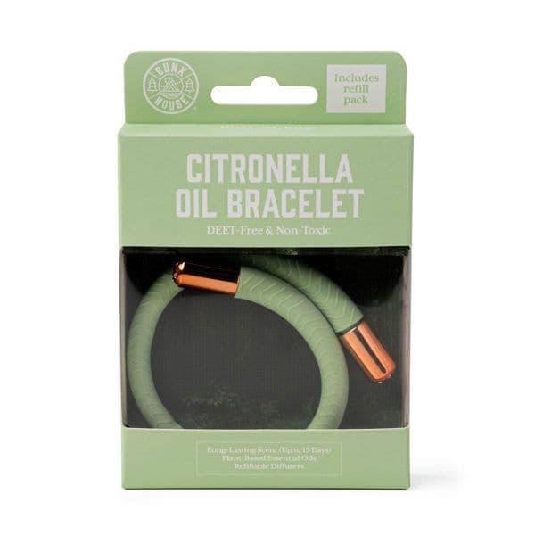 A flexible metal core; DEET-free & non-toxic citronella oil blend; dual-ended diffusers release non-toxic citronella oil; Lasts for up to 15 hours; non-slip silicone