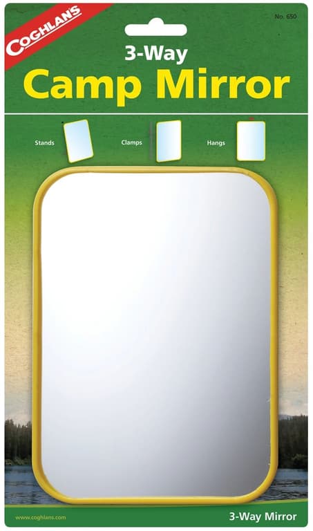 5" X 7" quality mirror in sturdy, colorful plastic frame. Unique metal hook on back enables mirror to stand - clamp on pole or hang. Handy for, trailers, tent trailers, summer cottage or home.Specifications