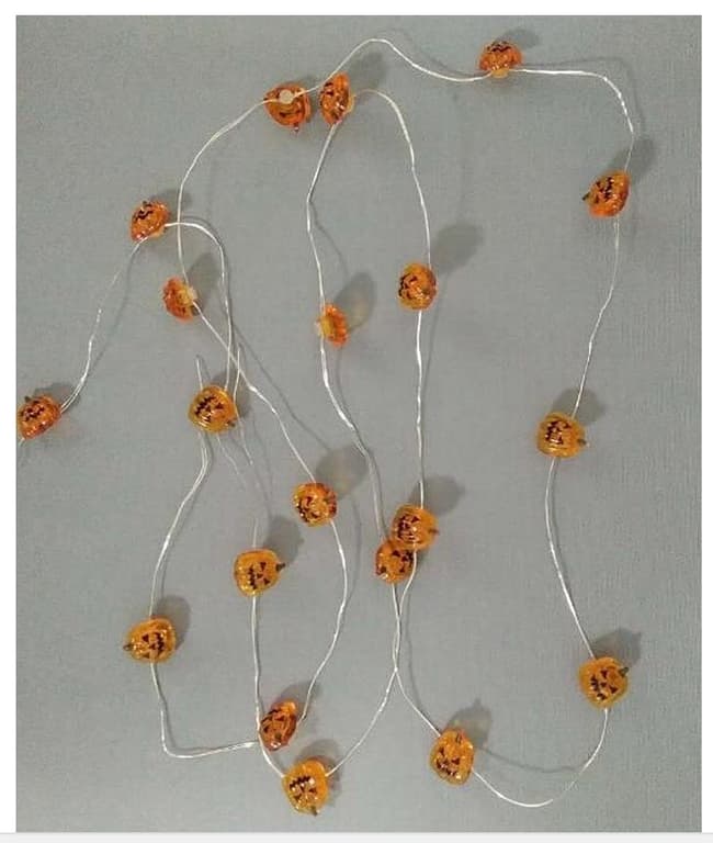 Jack-O-Lantern String lights, with 20 ea. LED Micro bulbs with 24" lead. Has multiple switch on/off/timer, with 6 hours and 18 hours off. Warm white bulbs. For indoor use only. Requires 3 AA batteries (not included)Specifications