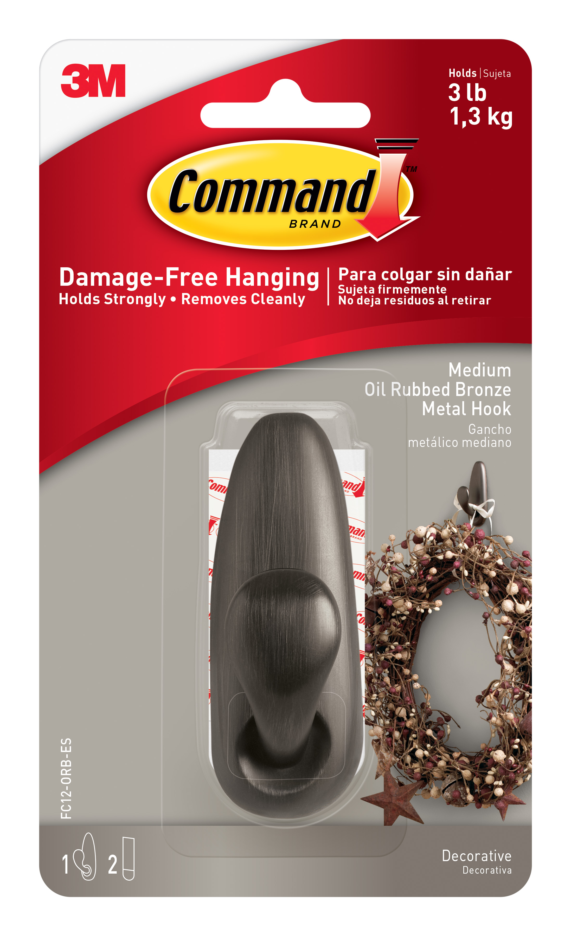 Command Metal Hooks are available in a variety of styles and finishes to match your decor. They also come in a variety of sizes and hold a surprising amount of weight up to five pounds! Forget about nails, screws and tacks, Command Metal Hooks are fast and easy to hang! Using the revolutionary Command Adhesive, Command Metal Hooks stick to many surfaces, including paint, wood, tile and more. Yet, they also come off leaving no holes, marks, sticky residue or stains so taking down or moving your Command Metal Hooks is simple and hassle free. And re hanging your hooks is as easy as applying a Command? Refill Strip, so you can use them again and again!Specifications