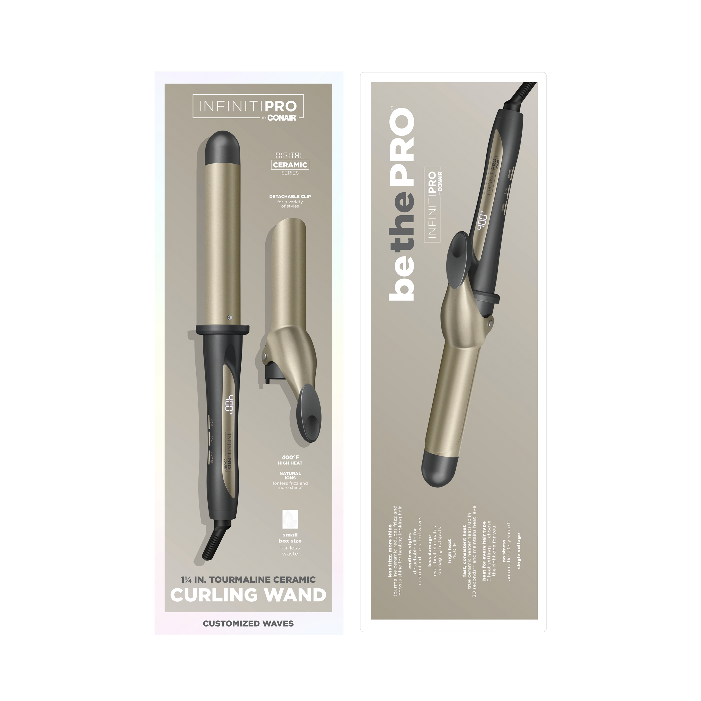 Frizz-fighting ions. Customizable temperature settings. Even heat for less damage. Detachable clip for versatile styling. Get it all and create the tousled waves you love with the InfinitiPRO by Conair 1 1/4" Tourmaline Ceramic Curling Wand. Designed to maximize curl definition, volume, and versatility, this styling essential features a tourmaline ceramic-coated barrel to reduce frizz and give you smooth, shiny results. The clip detaches to make it easy to explore a wide variety of looks. The true ceramic heater heats up in 30 seconds and generates consistent heat for a flawless finish as soon as it reaches a stabilized temperature. The temperature select buttons and digital LED display make it easy to customize heat for your hair type. Choose from 5 heat settings up to 400 degree F. With such a wide range of heat options, there's a setting for every hair type and texture.Specifications
