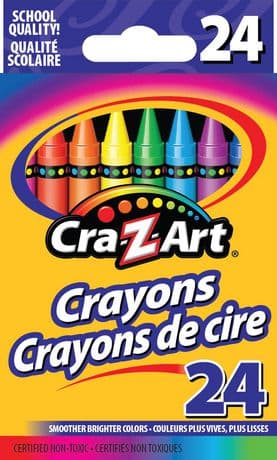 Cra-Z-art Crayons 24 CountCrayons for Kids Art Supplies Back To School SuppliesCra-Z-Art 10201 24 Count Assorted Colors Crayons. Cra-Z-Arts School Quality Crayons 24 Count come in 24 different colors for an endless rainbow of creativity - primary and secondary colors included! The crayons are smooth and bright! Crayons come pre-sharpened and are ready to go right out of the box. The crayons are school quality and AP certified nontoxic. Also smartly sized for easy travel to do projects away or on the go. Does not smudge or wipe off for long-lasting creativity! Less breakage and a great value for teachers too. Kids will have fun and draw for hours. Be always creative with Cra-Z-Art!.Specifications