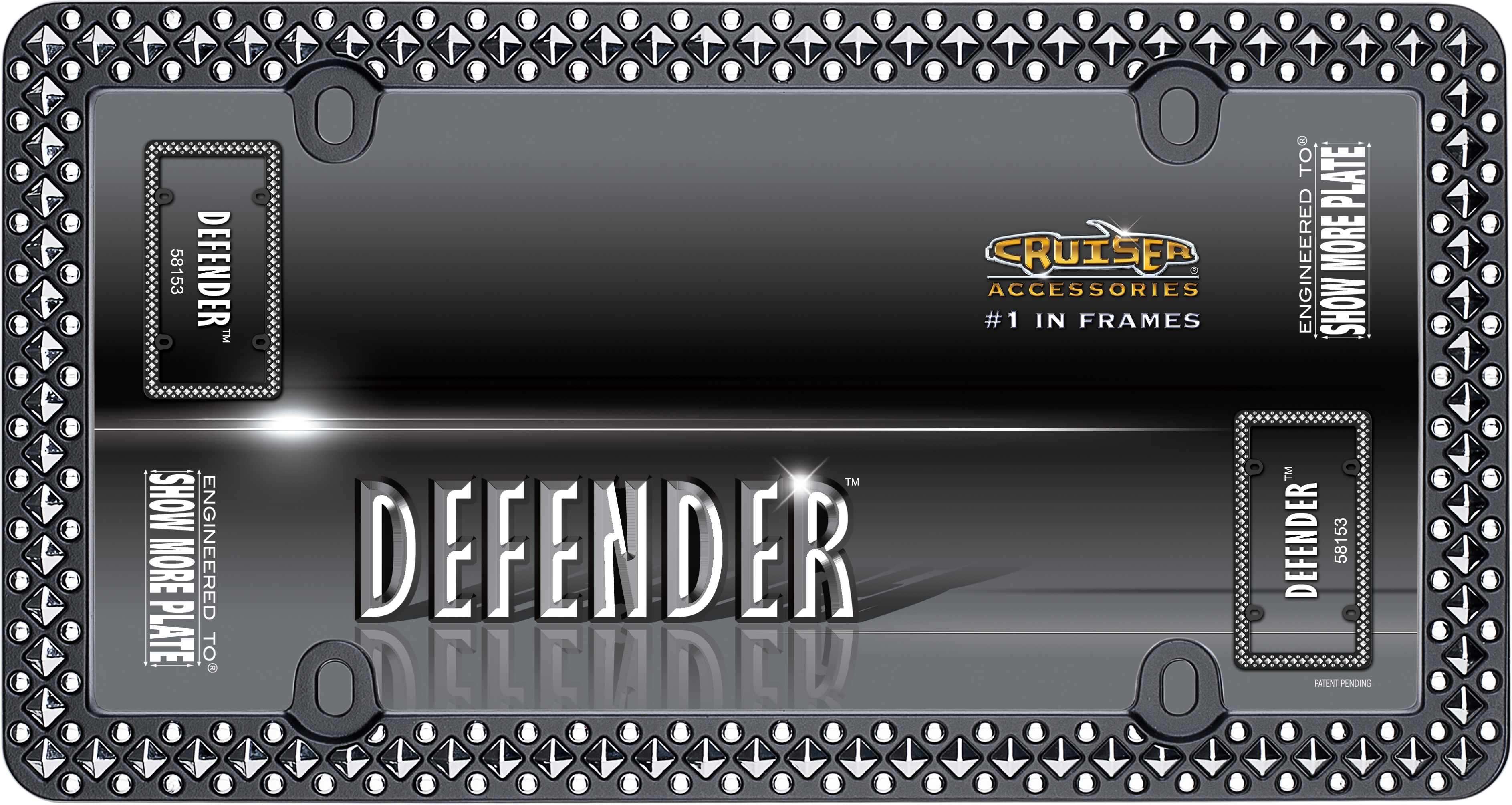 Cruiser Accessories Defender Matte Black/Chrome license plate frame features a studs & spikes look that takes you to the edgy side of your style.Specifications