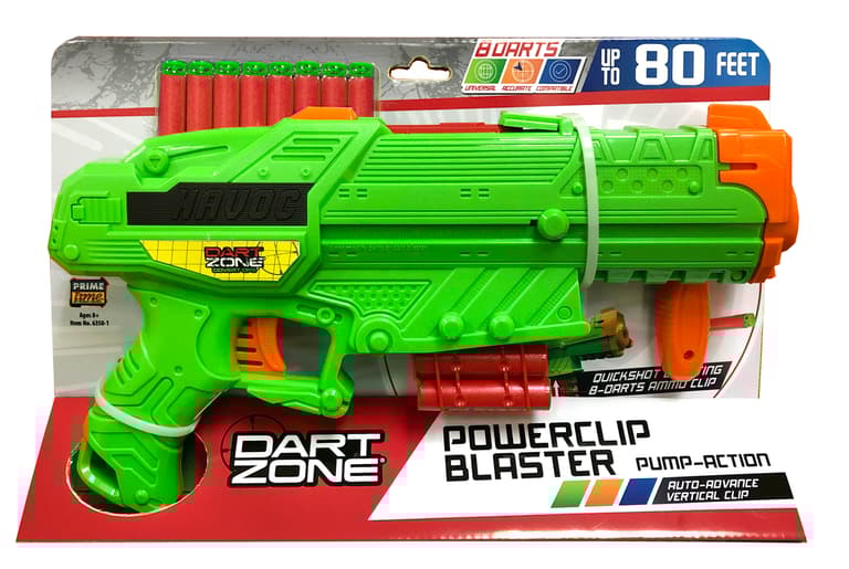 Powerclip Dart Blaster features a unique sideswipe tactical grip for ease in loading and firing during the most epic of dart battles. With trigger-fire action and with an auto-advance vertical clip, this blaster is sure to cause havoc on the enemy. Shoots up to 80 feet!Specifications
