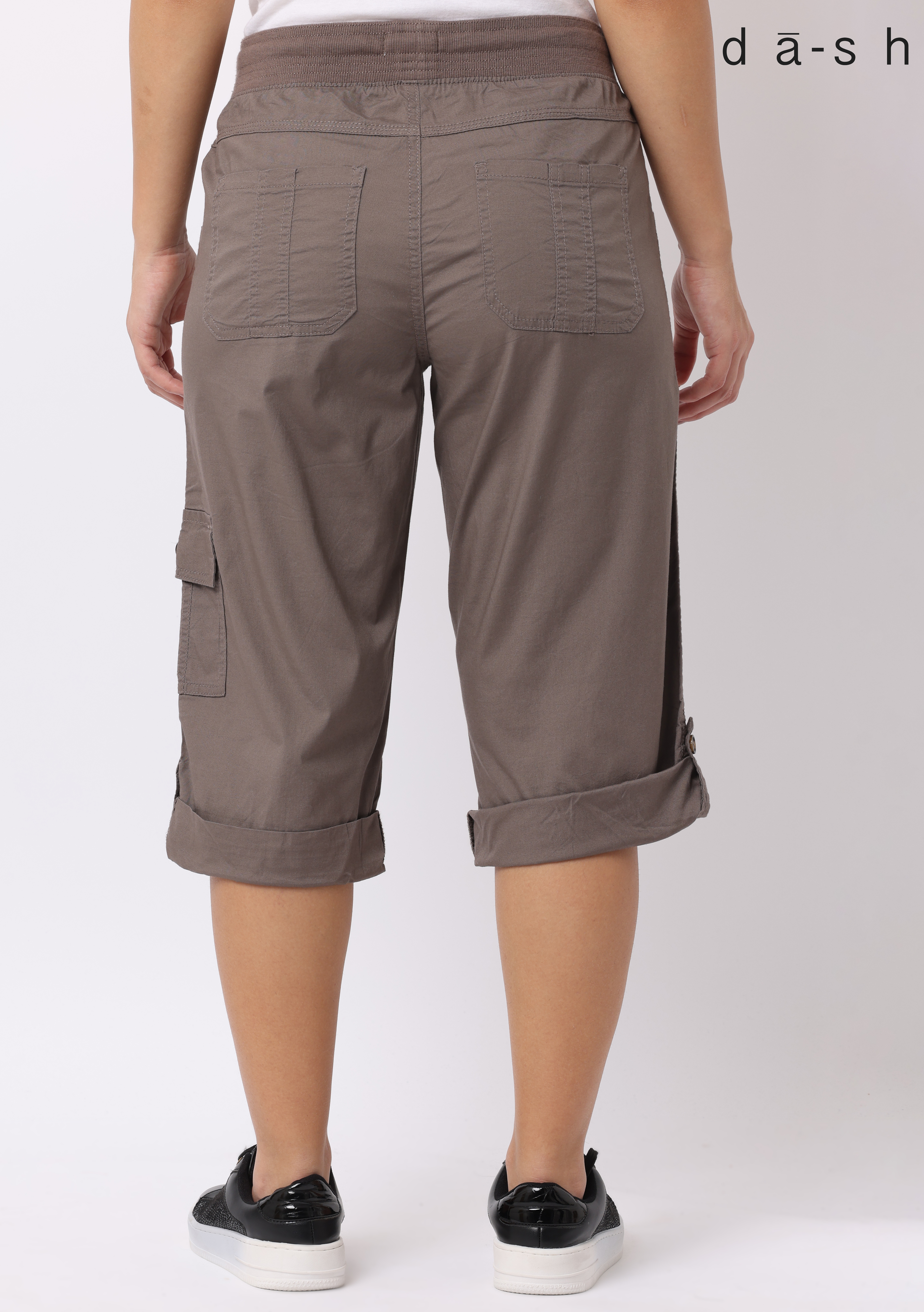 19" INSEAM; BUTTON UP ROLLED LEG OPTION; CARGO POCKET; COMFORT WAIST; FRONT AND BACK POCKETS; KNIT WAIST