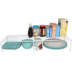 Helps you to maximize precious cabinet space by allowing you to utilize some of the unused room in your cabinetsStanding over 5.5 Inch tall there is room to slide a variety of kitchen items pantry goods craft or bathroom supplies underneath this shelfThe expandable feature allows you to completely customize how wide you want the shelf to be ranging from 16 to 32.5 InchThe Helper Shelf comes with plastic feet that prevent damage to your cabinets and provide stability by preventing sliding and movingComes with a white rust proof PE finish meaning it can be safely placed under sinks and other potentially wet places even use it in the freezer for extra space.Specifications