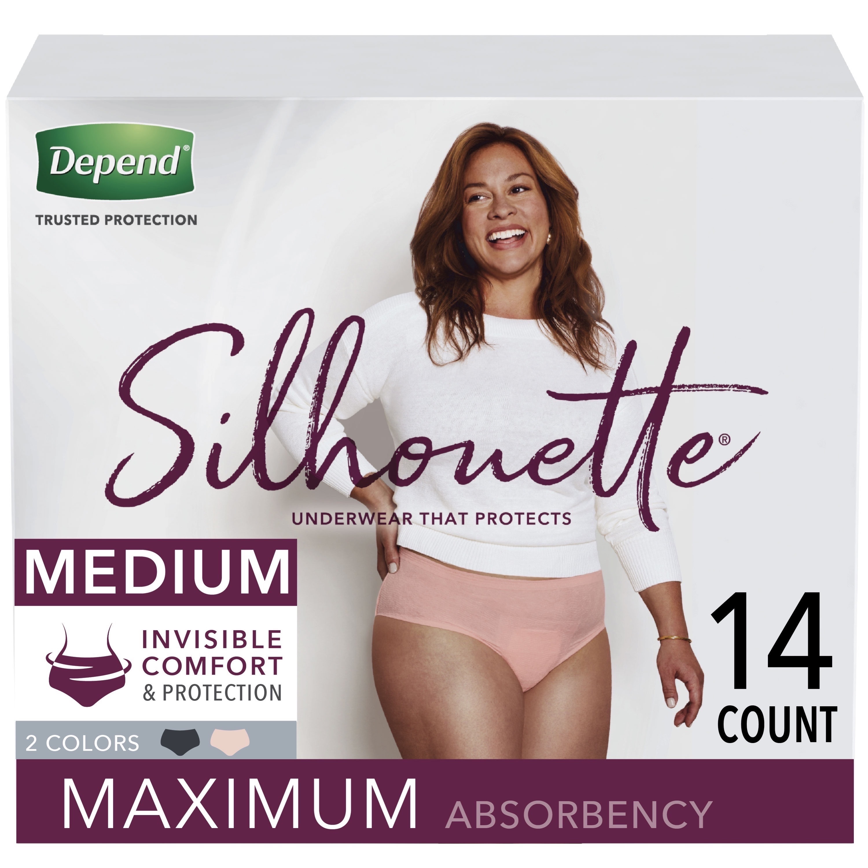 Be confident in all-day trusted protection against bladder leaks with underwear that’s gentle on your skin with Depend Silhouette Incontinence Underwear for Women. Our premium incontinence underwear for women features SkinGuard technology to help prevent skin irritation by shielding from irritants in urine and our soft liner that’s gentle on skin. Designed with shapewear fabric for invisible comfort and protection. Take on big bladder leaks and postpartum leaks thanks to a super absorbent core that absorbs up to 25x its weight, turning liquid into gel and neutralizing odors. Look as great as you feel with a discreet fit, soft and smooth fabric with tailored leg elastics to help prevent bladder leaks. Find your perfect look with three sizes: medium (32-42" waist), large (40-52" waist), or extra-large (50-60" waist). Also features stylish colors like black, pink, and berry.Specifications