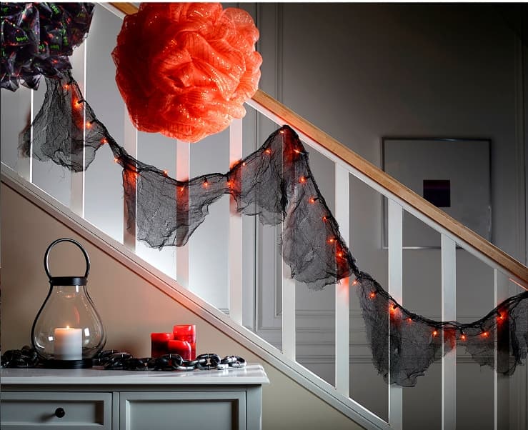 Add a touch of horror to your stairs, door, or porch! 9 feet of Spider Web Gauze with 35 Mini orange lights will add a special chill this Halloween. Comes with a 32" stacked UL approved cord.Specifications