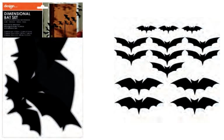 Bring the FRIGHT to your home with these assorted Bats. 24 bats, 4 Large, 7 Medium and 3 small PVC bats to hang or place on walls. Great for your Scary Party to hang on ceiling or place on Windows.Specifications