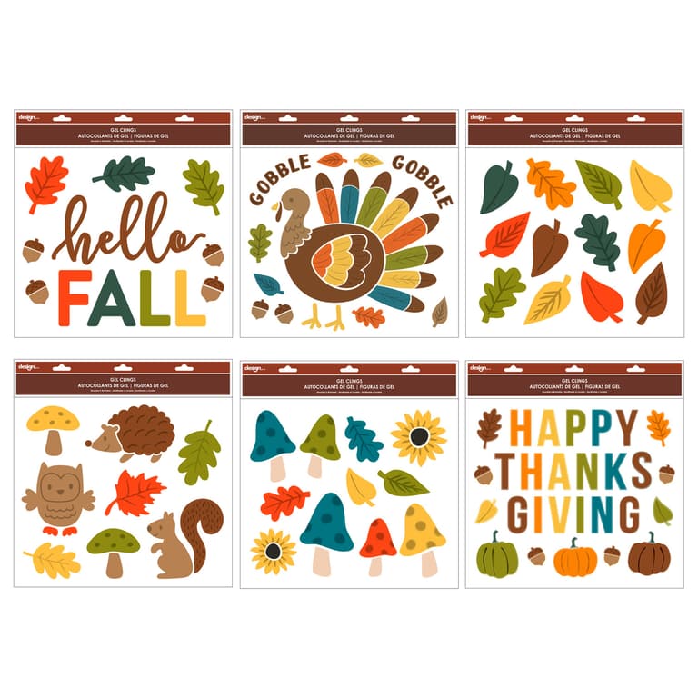 COLOR NOT GUARANTEED FOR ONLINE ORDERSCelebrate the fall season with these wonderful full color Gel Window Clings. 6 Assorted Designs to create great harvest scene on each window. Gel Clings are 11.5"x12". Designs Including: Hello Fall; Leaves, Happy Thanksgiving, and many more.Specifications