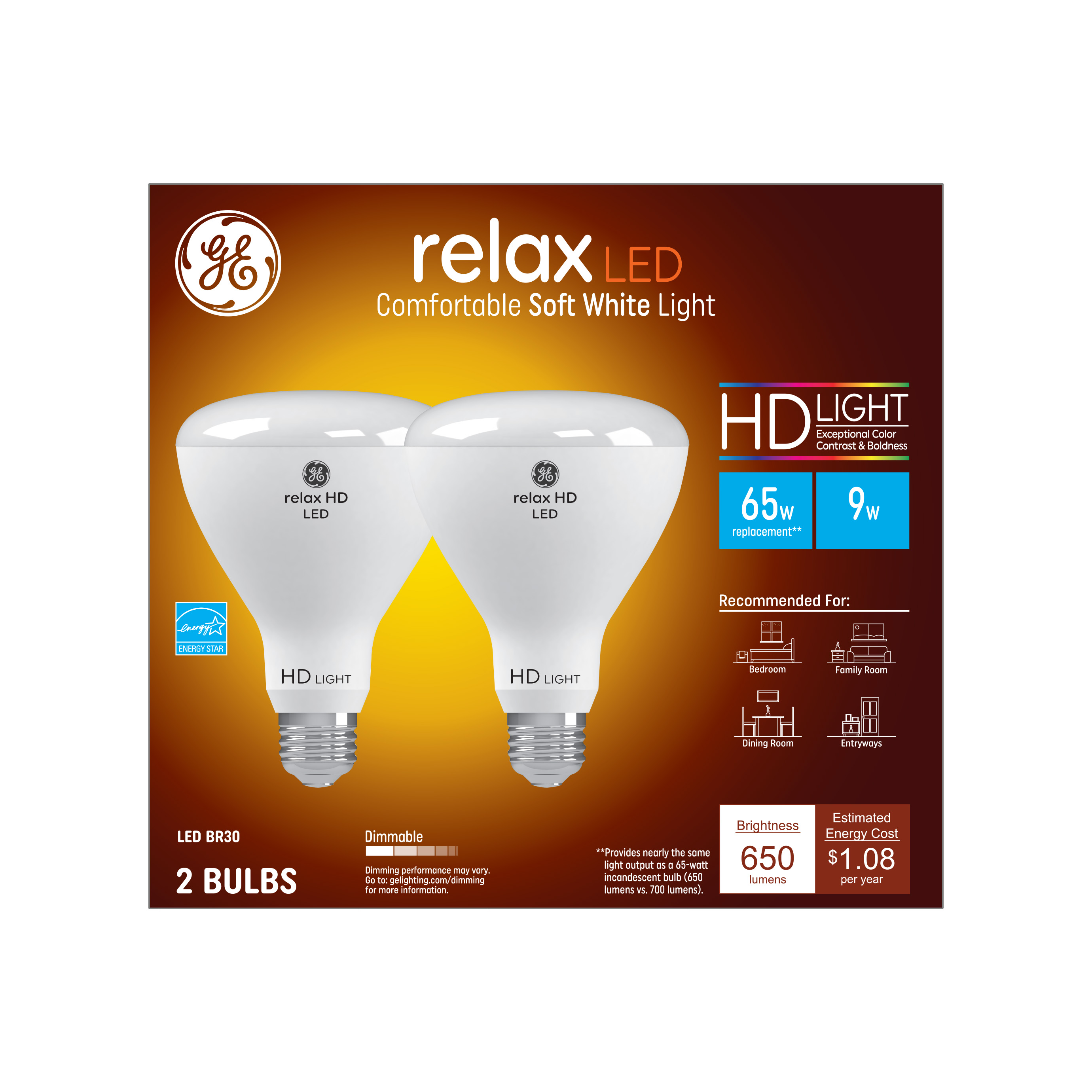 10W, Soft White, BR30, LED Relax HD Light Bulb, Equivalent To A 65W Incandescent, Medium Base, Dimmable, 650 Lumens, 2, 700 Kelvin Color Temperature, CRI 90, 13. 7 Year, 15, 000 Hours Rated Life, MOL 5. 4", Provides Exceptional Color Contrast and Boldness, Energy Star Compliant, Boxed.Specifications