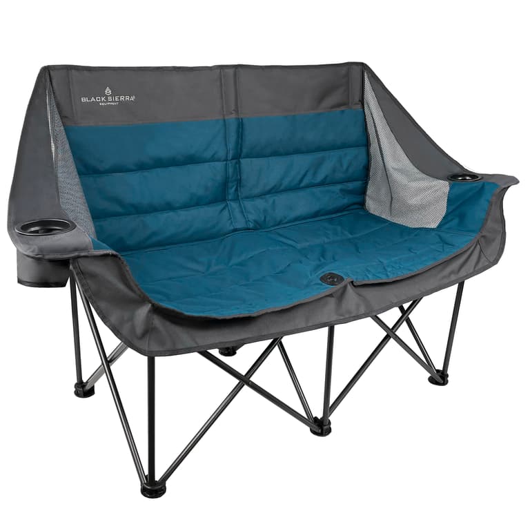 Made with durable poly oxford. The heavy-duty Double Wide sofa provides comfort while outdoors or on the sidelines. Padded seating and backrest offers all day comfort in the field or around basecamp, complete with dual cup holders to keep your drinks within reach. Heavy duty powder coated steel frame supports 500 lbs. (250 lbs. each side) This cushioned sofa measures 36.5 H, 58.25 L, 24.5 D when open. This oversized sofa only weighs 14.5 lbs. Carry bag included, making this sofa perfect for easy transport while camping, hunting, hiking, or on sidelines. Easy to set up and take down. Quick folding capability makes this the perfect sofa for any time you are on the go!Specifications