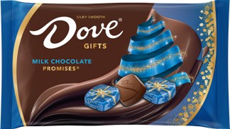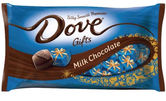 Contains Milk, Soy; Contains one (1) 8.87-ounce bag of DOVE PROMISES Holiday Gifts Milk Chocolate Candy; DOVE Holiday Milk Chocolate PROMISES Candy are a premium, festive chocolate experience; Individually wrapped milk chocolate candies make a delightful chocolate gift; Surprise friends and coworkers with rich, creamy DOVE PROMISES Candy as a holiday treat