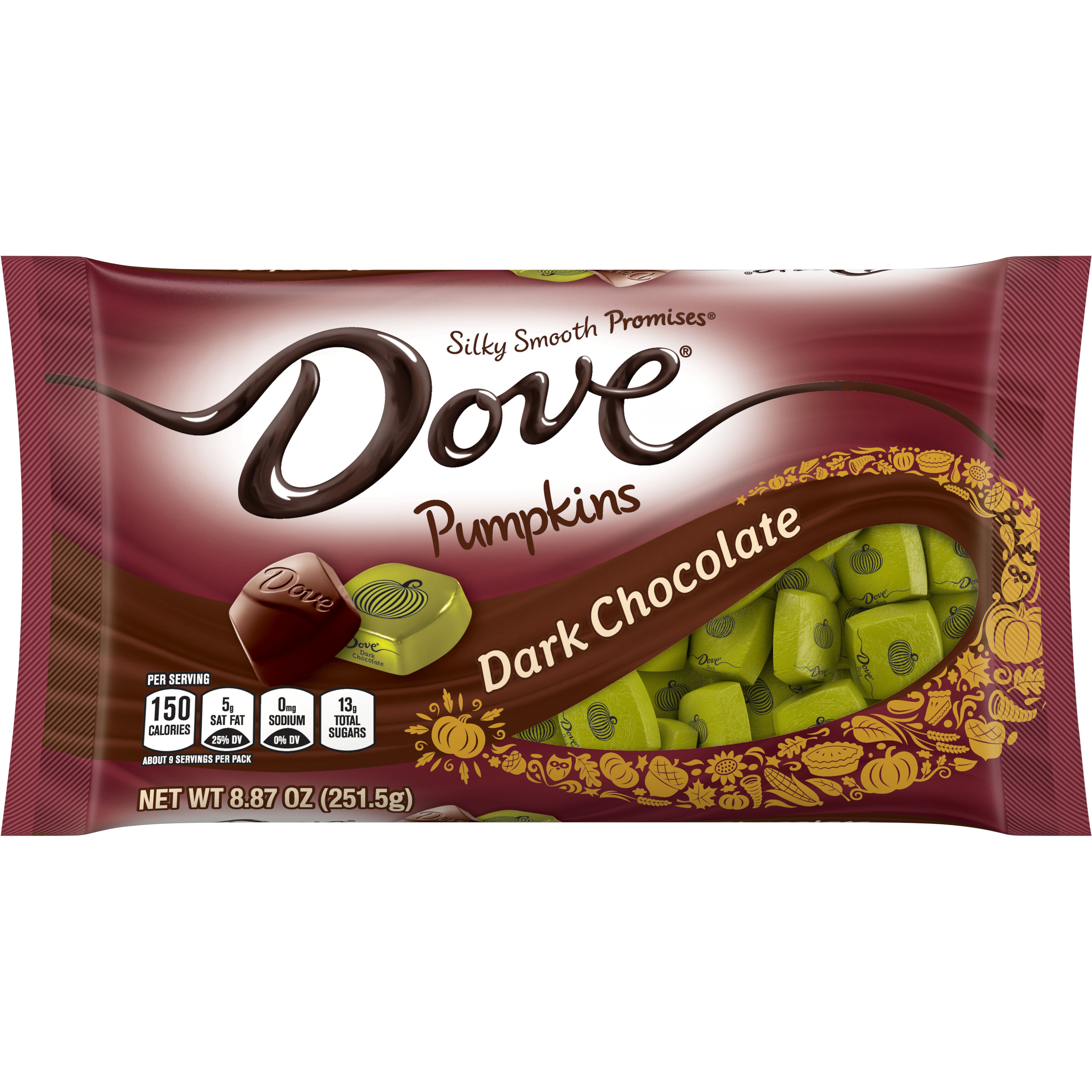 Contains Milk, Soy; Contains one (1) 8.87-ounce bag of DOVE PROMISES Dark Chocolate Harvest Pumpkin Halloween Candy; Individually wrapped in festive fall foils to decorate your candy bowl; Made with real dark chocolate for a delicious Halloween treat; Perfect for sharing with friends, family or the office to celebrate Halloween; Treat Halloween party guests or trick-or-treaters to a moment of chocolate joy