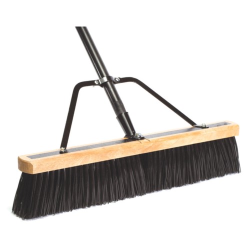 1-1/8 x 60 bolt on handle with foam grip; 24 broom head; Black bristles; Ideal for indoor and outdoor use on wet or dry surfaces; Lacquered hardwood block with holes for brace; Push broom; Stiff polypro fill