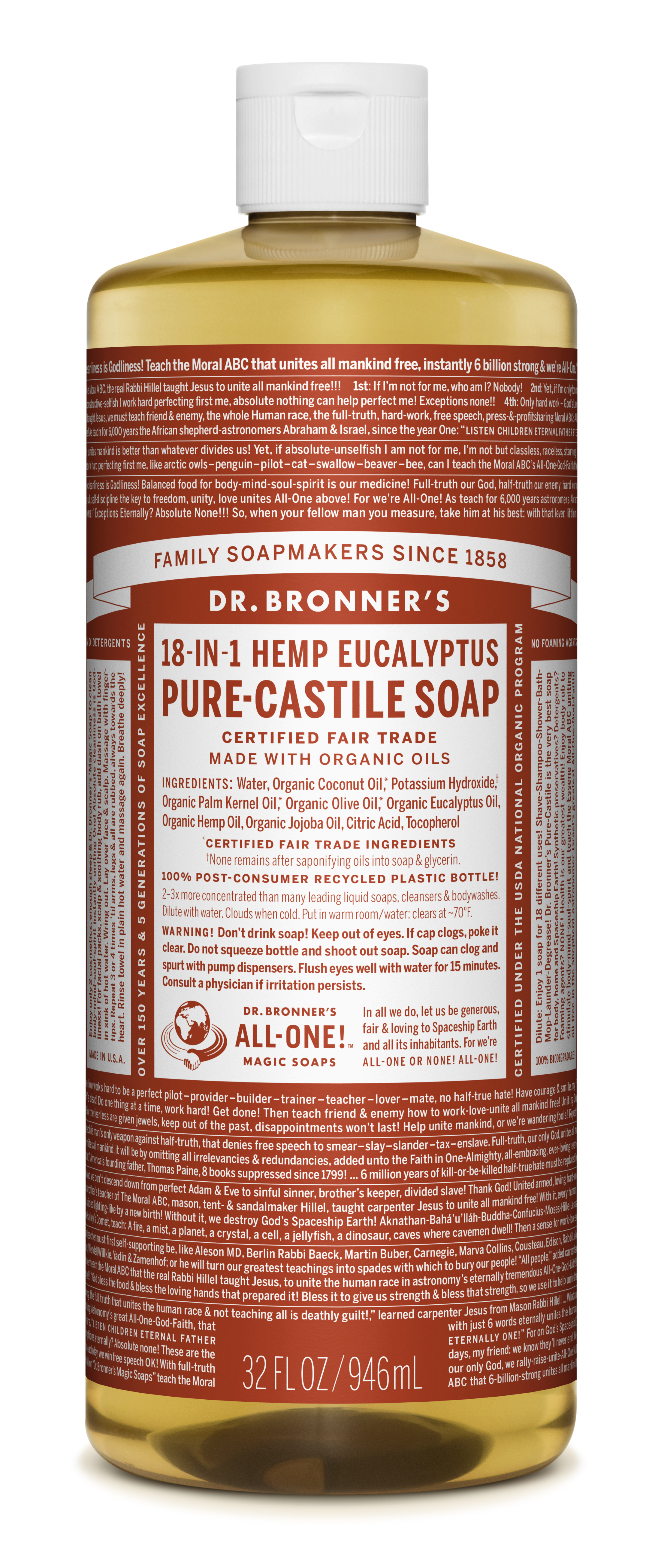 Earthy and warm, with a powerful menthol burst to clear congestion and focus the mind! Scented purely with organic eucalyptus oil, our Eucalyptus Pure-Castile Liquid Soap is concentrated, biodegradable, versatile and effective. Made with organic and certified fair trade ingredients, packaged in a 100% post-consumer recycled bottle. All-One! Dr. Bronner’s 18-in-1 Pure-Castile Soaps are good for just about any cleaning task. Face, body, hair & dishes, laundry, mopping, pets-clean your house and body with no synthetic preservatives, detergents or foaming agents-none! Dilute! Dilute! OkSpecifications