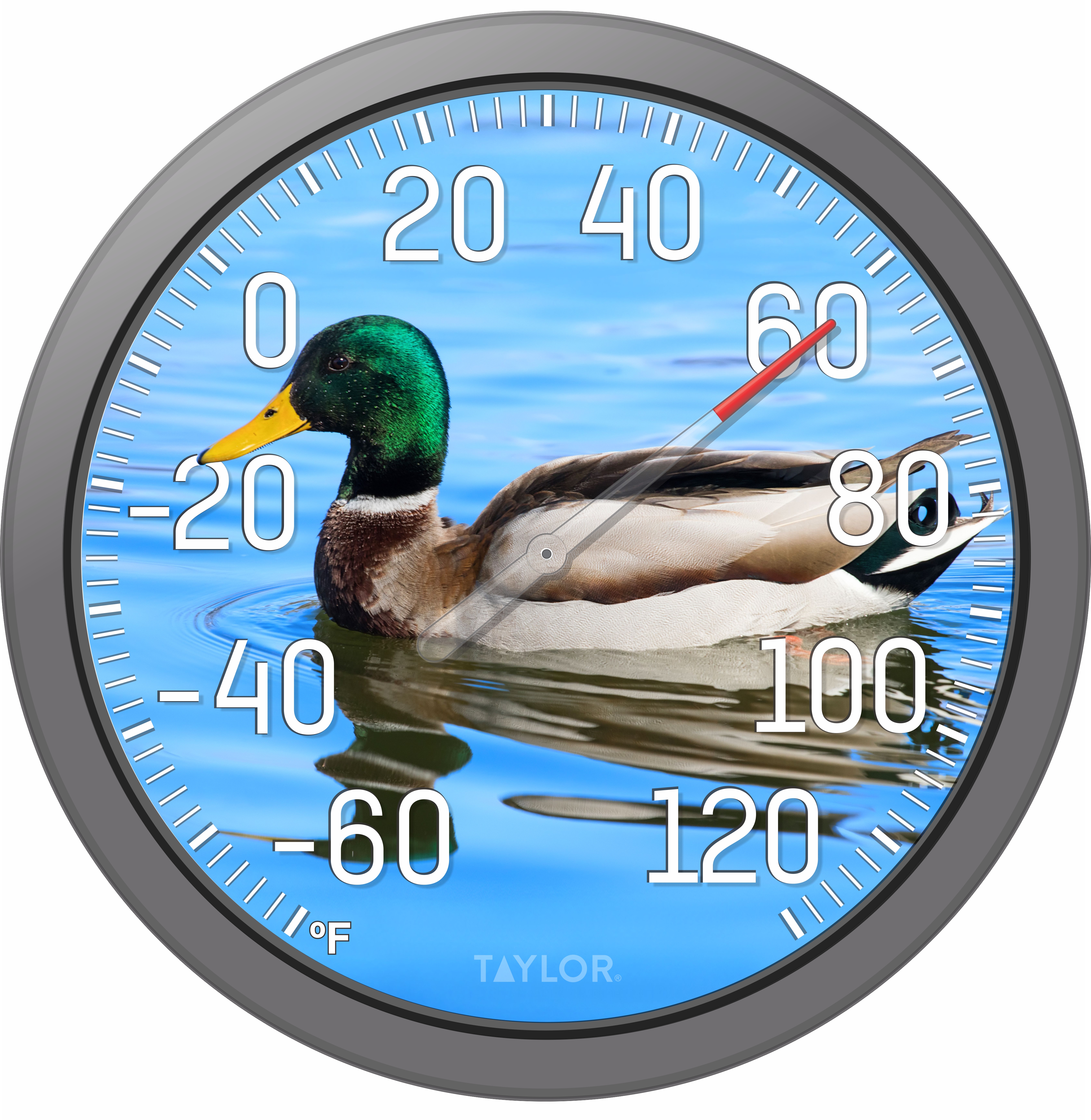 Durable indoor/outdoor thermometer with a grey bezel, shatterproof lens, and temperature range of -60°F to 120°F, built to withstand harsh elements.Specifications