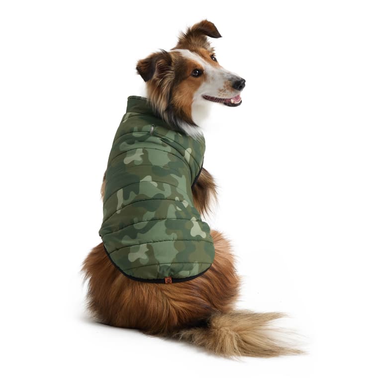 Camouflage puffer jacket; Easy-to-adjust Velcro closures at the neck and belly for a perfect fit; Leash keyhole; Polar fleece lining; Polyester shell and filling