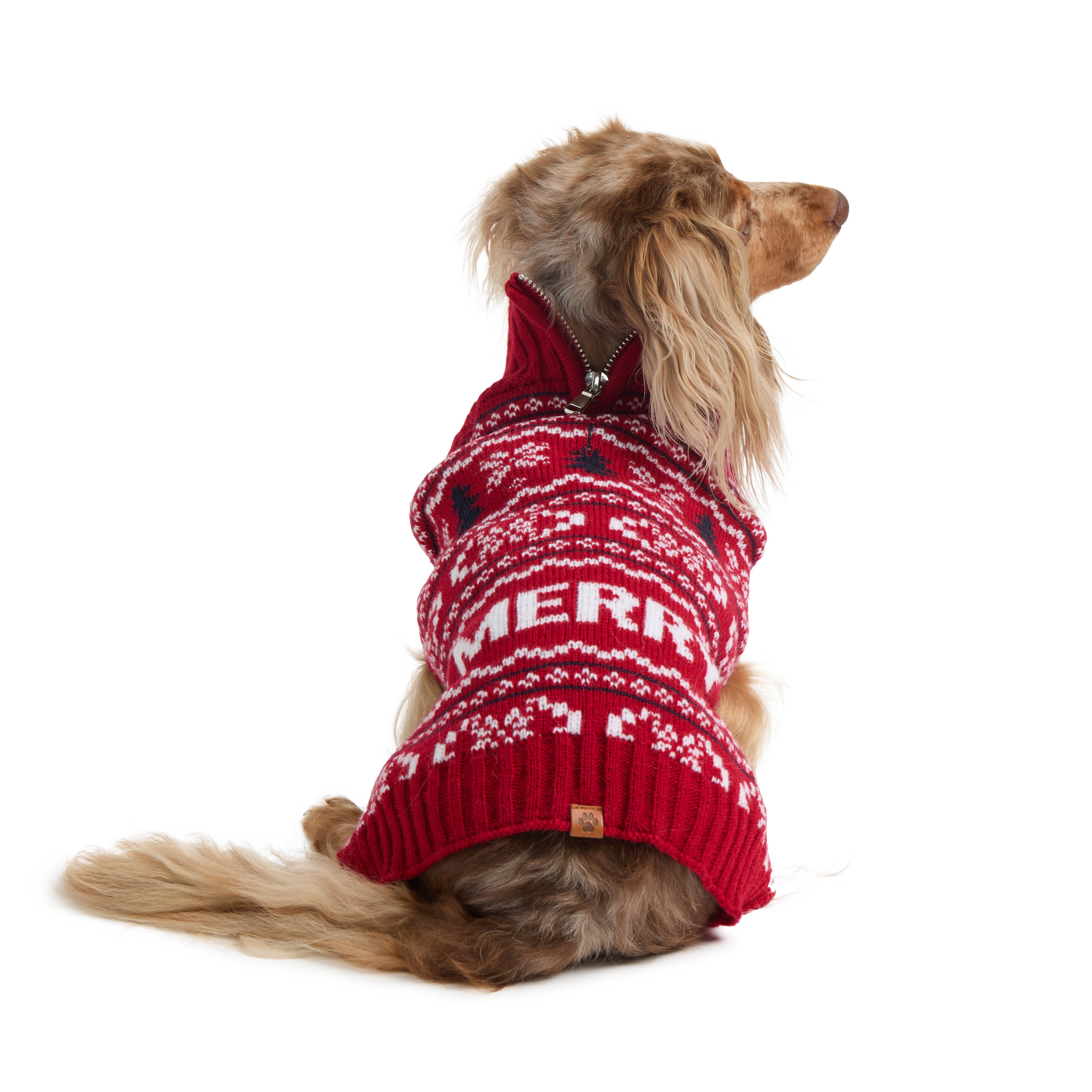 Wrap your pup in holiday cheer with this mock neck knitted dog sweater. Featuring a festive Fairisle jacquard design, it includes a convenient zipper at the neck and slits at the front legs for a perfect fit. Made from soft, cozy fabric, it's the ideal choice for keeping your dog warm and stylish all season long.Specifications