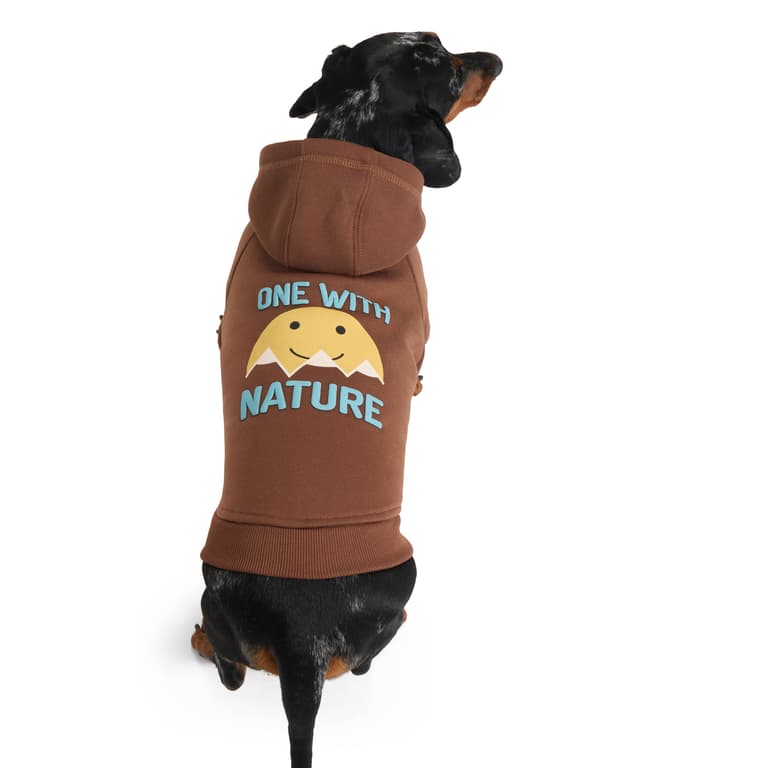 Embrace the great outdoors in style with this nature-themed print fleece! Let your dog feel "One with Nature" in this cozy, adventurous hoodie. The hood conveniently snaps into place when not in use, adding a touch of practicality. Crafted from soft, fleece fabric with ribbed hems and cuffs for extra comfort, it also features a handy leash keyhole, making it perfect for both cozy days and outdoor explorations.Specifications