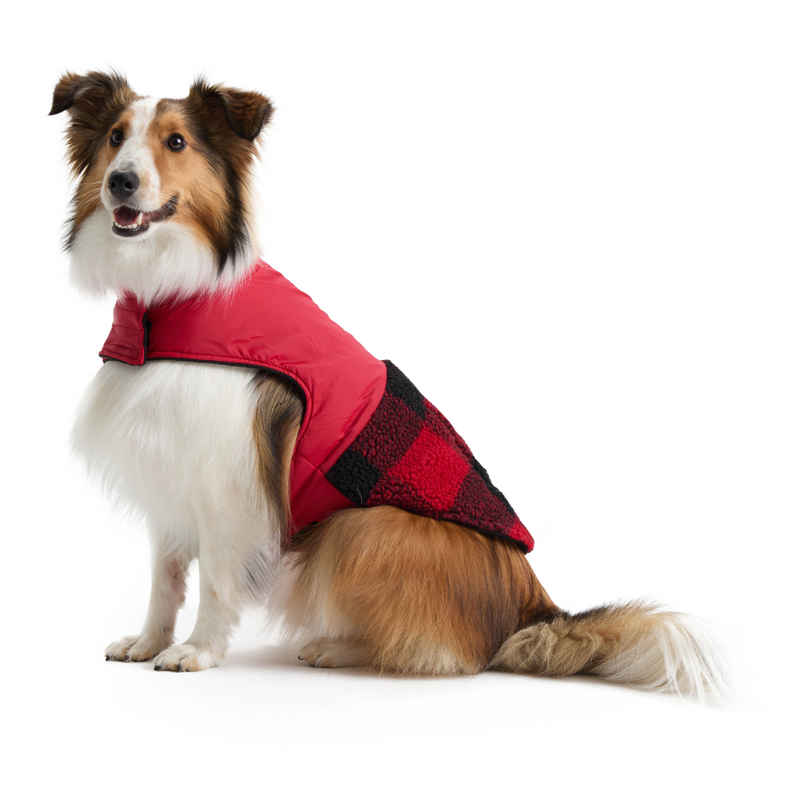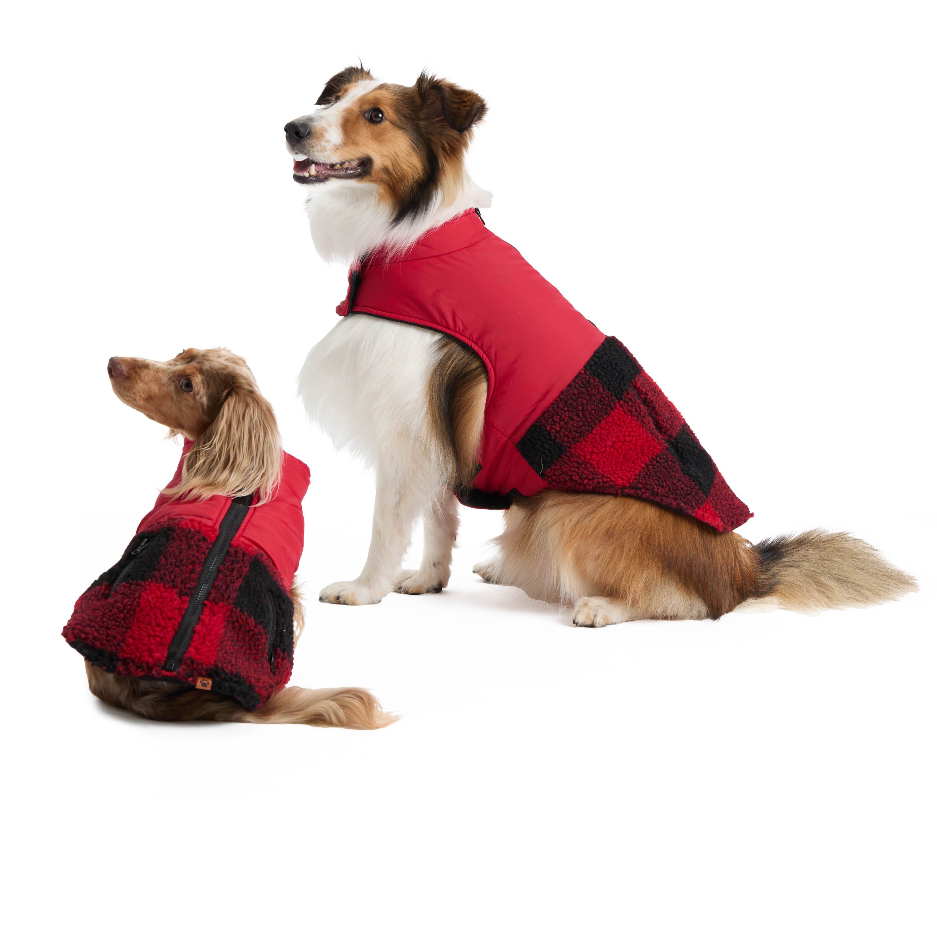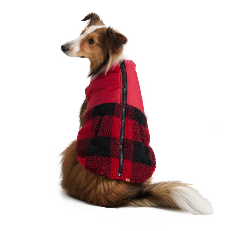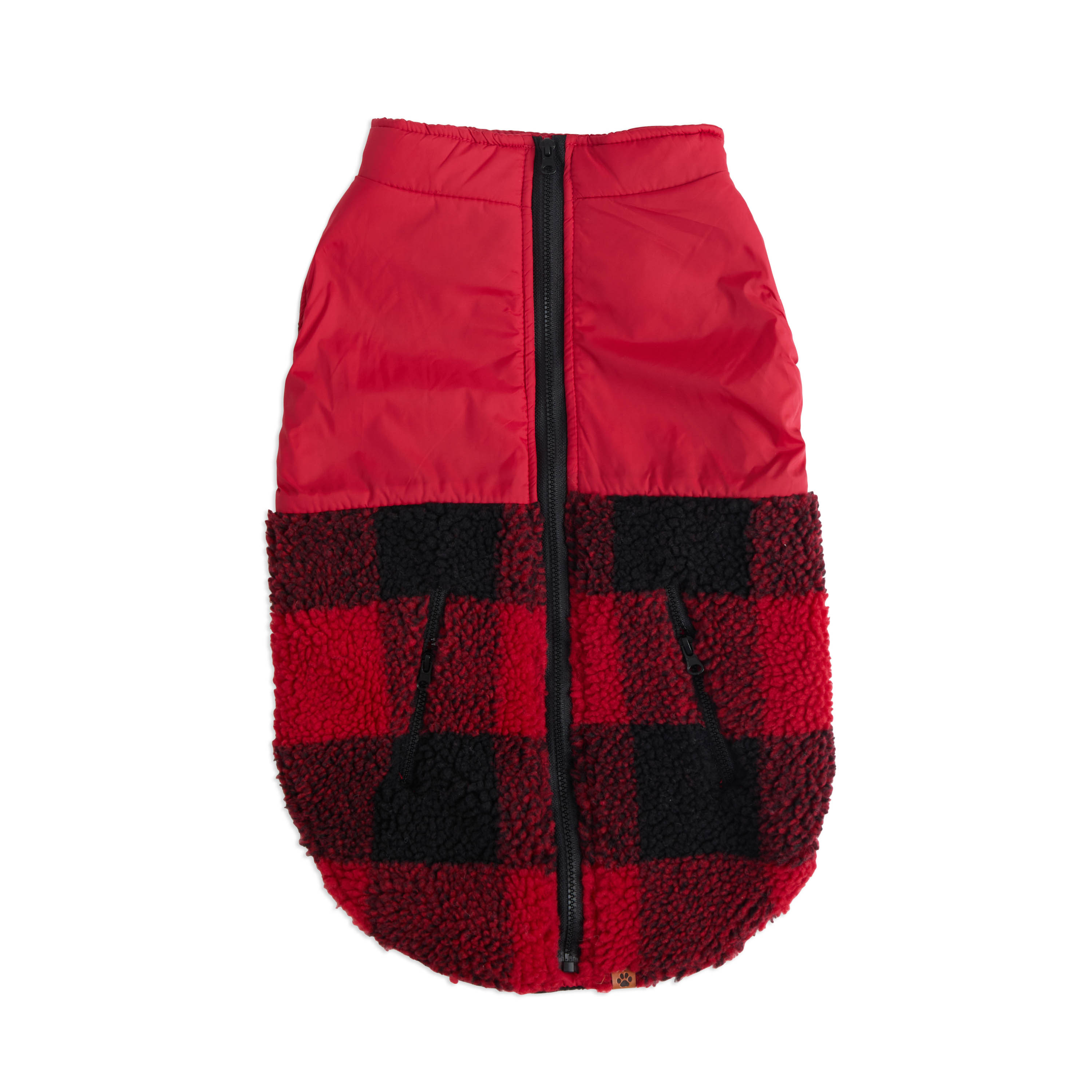 Embrace the cozy cabin vibe wherever you go with a touch of rugged plaid. This stylish jacket blends sherpa and nylon for the perfect mix of warmth and outdoor charm. Designed with easy-adjust Velcro closures at the neck and belly, it offers the perfect fit for your pup. Decorative zippers and pockets add a playful touch, while the soft polar fleece lining keeps your dog warm and snug on every walk. A must-have for pups who love to stay stylish and comfy, indoors or out!Specifications