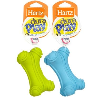 Exterior is made of firm natural latex for durability; interior consists of a unique foam technology for a chewier bouncier toy with an irresistible squeaker Includes a medium version of Hartz signature Dura Play Bone for dogs 20-50 pounds Bacon scented