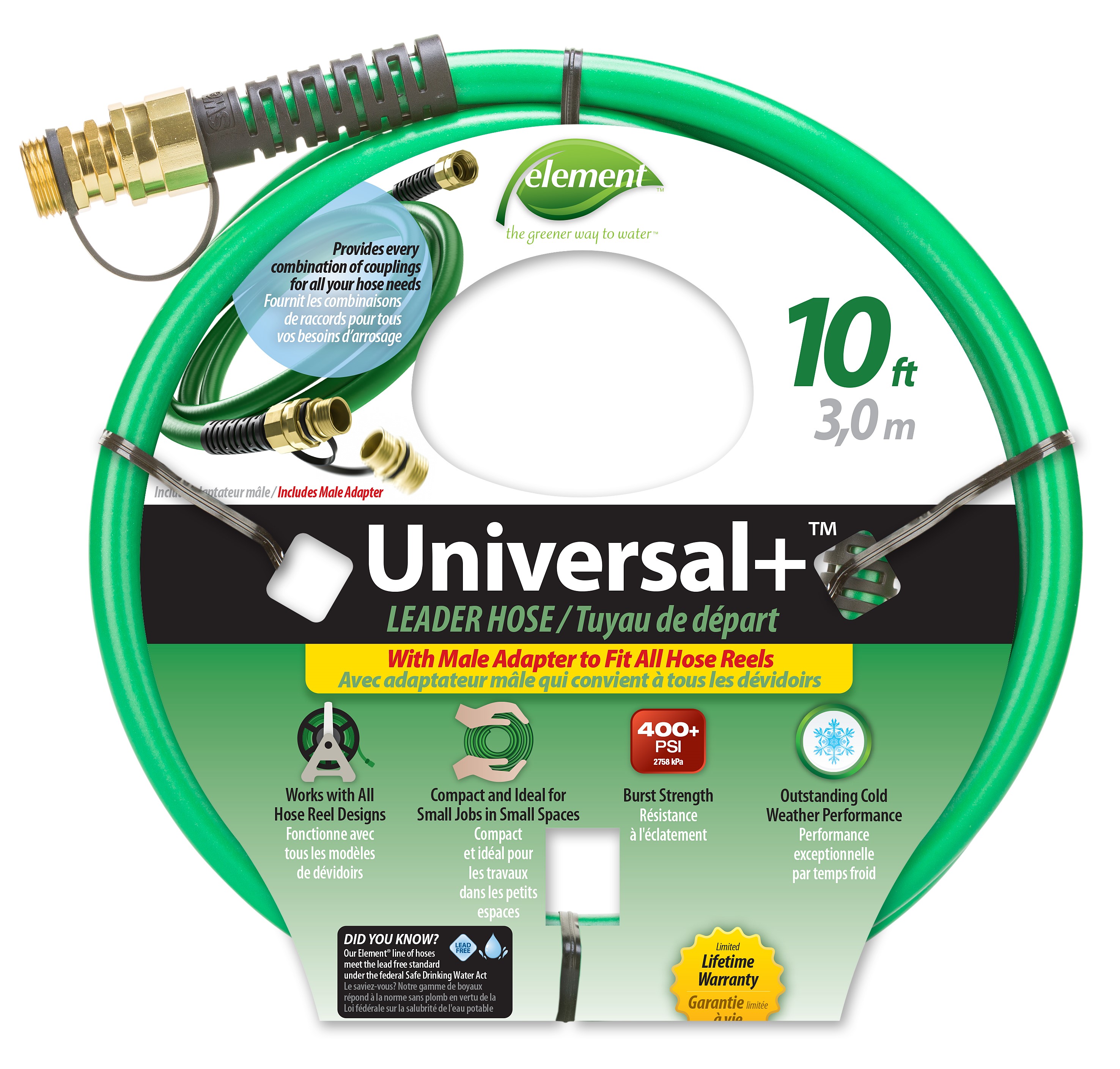 With female couplings on both ends and a male adaptor, this 10' hose is truly universal for any hose reel on the market. This leader hose is also versatile for extending your garden hose, as a connector hose for your hose reel, as a soaker system leader hose and as a dehumidifier drain hose.Specifications